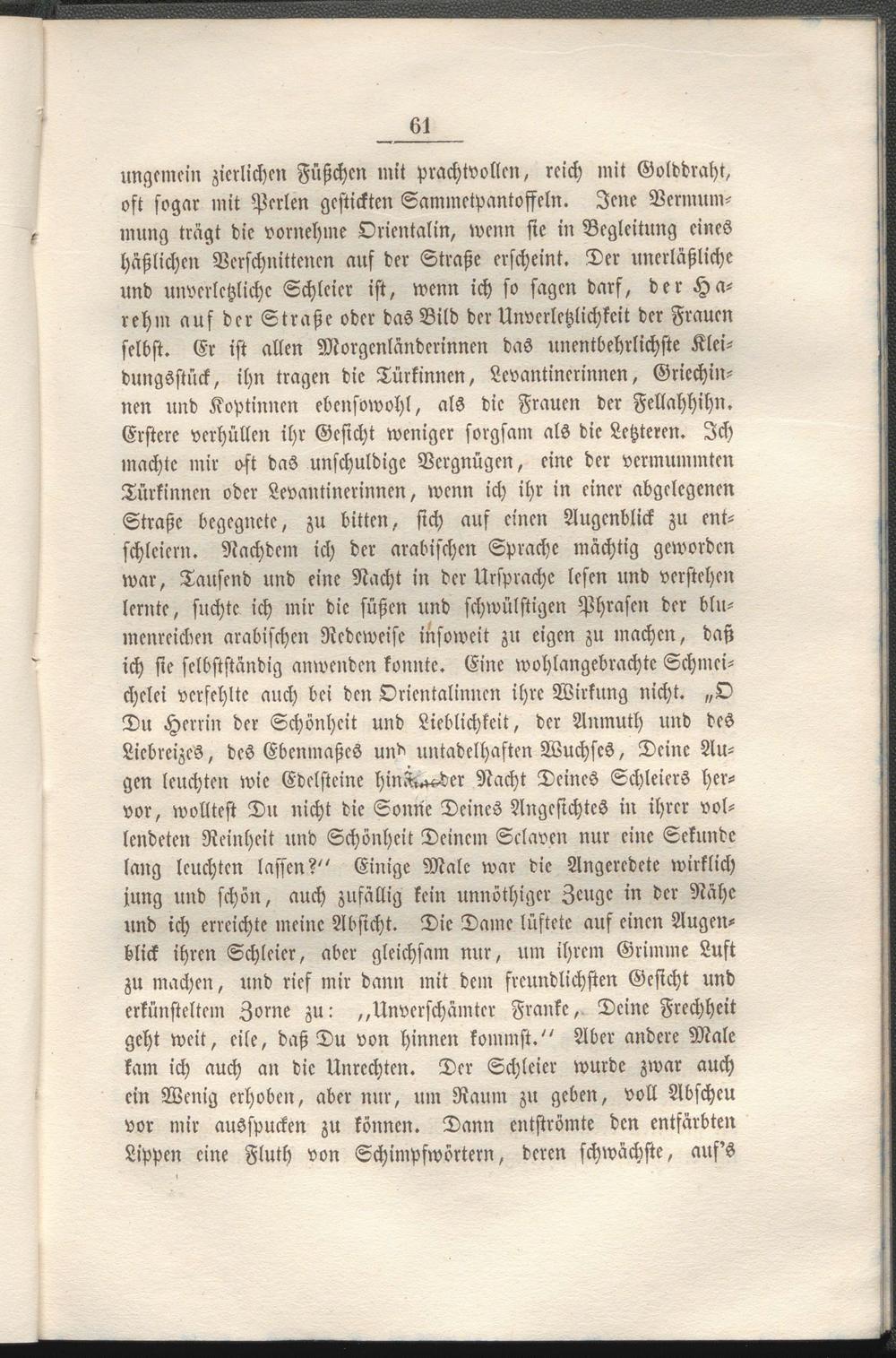 ungcmein zierlichen Füßchen mit prachtvollen, reich mit Golddraht, oft sogar mit Perlen gestickten Sammetpantoffeln. Jene Verimun- mung trägt die vornehme Orientalin, wenn sie in Begleitung eines häßlichen Verschnittenen auf der Straße erscheint. Der unerläßliche und unverletzliche Schleier ist, wenn ich so sagen darf, der Ha- rehm auf der Straße oder das Bild der Unverletzlichkeit der Frauen selbst. Er ist allen Morgcnländerinnen das unentbehrlichste Kleidungsstück, ihn tragen die Türkinnen, Levantincrinnen, Griechinnen und Koptinncn ebensowohl, als die Frauen der Fellahhihn. Erstere verhüllen ihr Gesicht weniger sorgsam als die Letzteren. Ich machte mir oft das unschuldige Vergnügen, eine der vermummten Türkinnen oder Levantincrinnen, wenn ich ihr in einer abgelegenen Straße begegnete, zu bitten, sich auf einen Augenblick zu entschleiern. Nachdem ich der arabischen Sprache mächtig geworden war, Tausend und eine Nacht in der Ursprache lesen und verstehen lernte, suchte ich mir die süßen und schwülstigen Phrasen der blu- mcnreicken arabischen Redeweise insoweit zu eigen zu machen, daß ich sie sclbstständig anwenden konnte. Eine wohlangebrachtc Schmeichelei verfehlte auch bei den Orientalinnen ihre Wirkung nicht. „O Du Herrin der Schönheit und Lieblichkeit, der Anmuth und des Liebreizes, des Ebenmaßes uiw untadelhaften Wuchses, Deine Augen leuchten wie Edelsteine hinill^der Nacht Deines Schleiers hervor, wolltest Du nicht die Sonne Deines Angesichtes in ihrer vollendeten Reinheit und Schönheit Deinem Sclaven nur eine Sekunde lang leuchten lassen?" Einige Male war die Angeredete wirklich jung und schön, auch zufällig kein unnöthigcr Zeuge in der Nähe und ich erreichte meine Absicht. Die Dame lüftete auf einen Augenblick ihren Schleier, aber gleichsam nur, um ihrem Grimme Luft zu machen, und rief mir dann mit dem freundlichsten Gesicht und erkünsteltem Zorne zu: ,,Unverschämter Franke, Deine Frechheit geht weit, eile, daß Du von hinnen kommst." Aber andere Male kam ich auch an die Unrechten. Der Schleier wurde zwar auch ein Wenig erhoben, aber nur, um Raum zu geben, voll Abscheu vor mir ausspucken zu können. Dann entströmte den entfärbten Lippen eine Fluth von Schimpfwörtern, deren schwächste, auf's