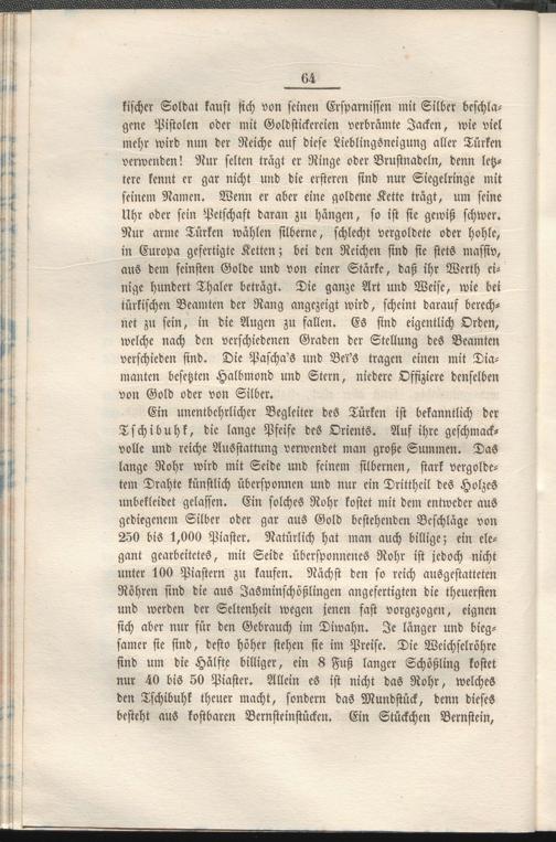Ein unentbehrlicher Begleiter des Türken ist bekanntlich der Tschibuhk, die lange Pfeife des Orients. Auf ihre geschmackvolle und reiche Ausstattung verwendet man große Summen. Das lange Rohr wird mit Seide und feinem silbernen, stark vergoldetem Drahte künstlich überspannen und nur ein Dritthcil des Holzes unbekleidet gelassen. Ein solches Rohr kostet mit dem entweder aus gediegenem Silber oder gar aus Gold bestehenden Beschläge von 250 bis 1,000 Piaster. Natürlich hat man auch billige; ein elegant gearbeitetes, mit Seide übcrsponnenes Rohr ist jedoch nicht unter 100 Piastern zu kaufen. Nächst den so reich ausgestatteten Röhren sind die aus Jasminschößlingen angefertigten die theuersten und werden der Seltenheit wegen jenen fast vorgezogen, eignen sich aber nur für den Gebrauch im Diwahn. Je länger und biegsamer sie sind, desto höher stehen sie im Preise. Die Weichselröhre sind um die Hälfte billiger, ein 8 Fuß langer Schößling kostet nur 40 bis 50 Piaster. Allein es ist nicht das Rohr, welches den Tschibuhk theuer macht, sondern das Mundstück, denn dieses besteht aus kostbaren Bernsteinstücken. Ein Stückchen Bernstein,