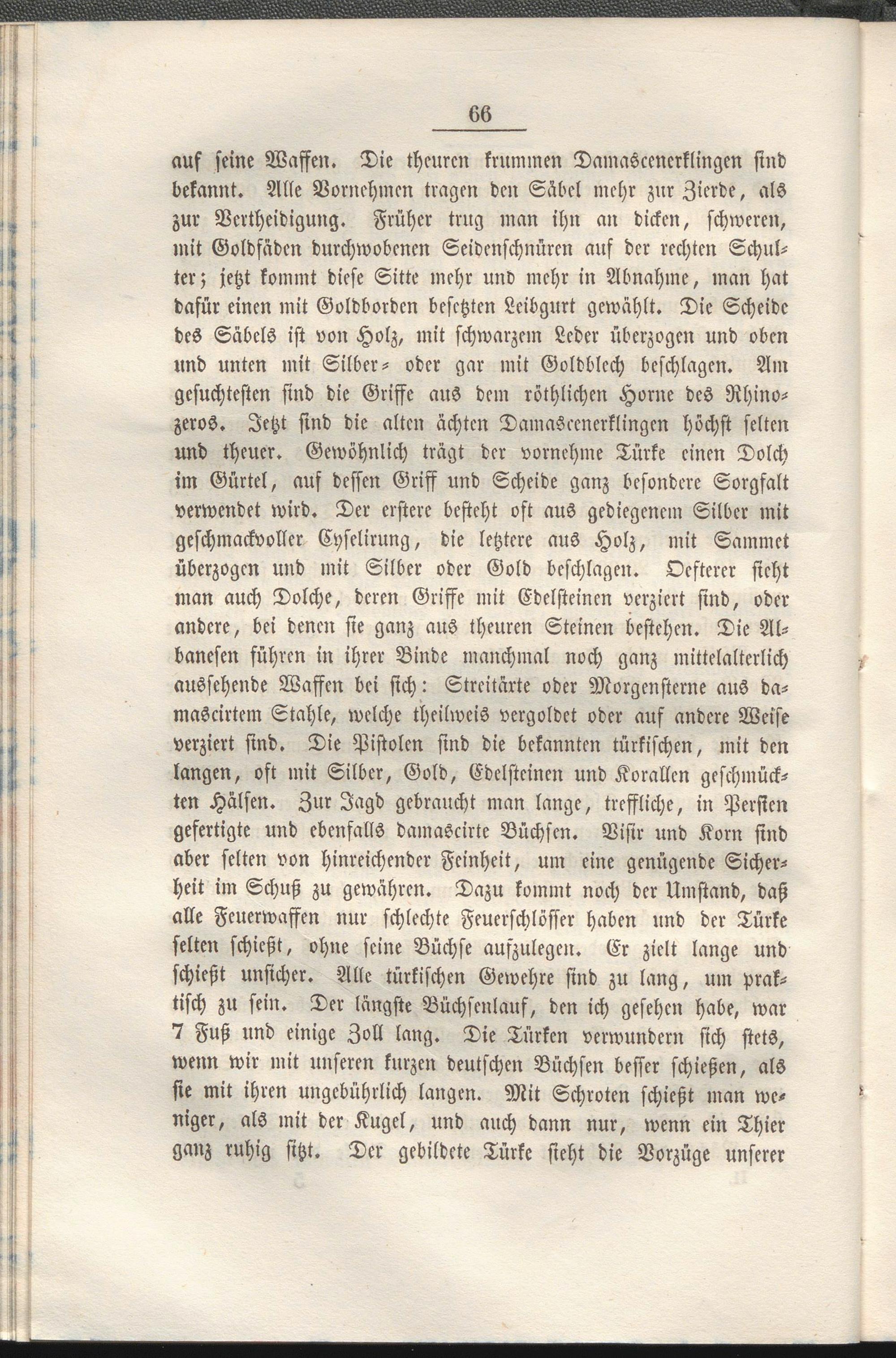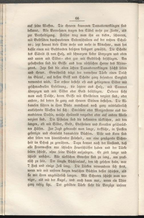 auf seine Waffen. Die theuren krummen Damascencrklingen sind bekannt. Alle Vornehmen tragen den Säbel mehr zur Zierde, als zur Vertheidigung. Früher trug man ihn an dicken, schweren, mit Goldfäden durchwobencn Seidenschnürcn auf der rechten Schulter; jetzt kommt diese Sitte mehr und mehr in Abnahme, man hat dafür einen mit Goldbordcn besetzten Leibgurt gewählt. Die Scheide des Säbels ist von Holz, mit schwarzem Leder überzogen und oben und unten mit Silber- oder gar mit Goldblech beschlagen. Am gesuchtesten sind die Griffe aus dem röthlichen Home des Rhino- zeros. Jetzt sind die alten ächten Damasecnerklingcn höchst selten und theuer. Gewöhnlich trägt der vornehme Türke einen Dolch im Gürtel, auf dessen Griff und Scheide ganz besondere Sorgfalt verwendet wird. Der erstere besieht oft aus gediegenem Silber mit geschmackvoller Cyselirung, die letztere aus Holz, mit Sammet überzogen und mit Silber oder Gold beschlagen. Oesterer sieht man auch Dolche, deren Griffe mit Edelsteinen verziert sind, oder andere, bei denen sie ganz aus theuren Steinen bestehen. Die Al- banesen führen in ihrer Binde manchmal noch ganz mittelalterlich aussehende Waffen bei sich: Strcitärte oder Morgensterne aus da- mascirtcm Stahle, welche theilwcis vergoldet oder auf andere Weise verziert sind. Die Pistolen sind die bekannten türkischen, mit den langen, oft mit Silber, Gold, Edelsteinen und Korallen geschmückten Hälsen. Zur Jagd gebraucht man lange, treffliche, in Perstcn gefertigte und ebenfalls damascirte Büchsen. Visir und Korn sind aber selten von hinreichender Feinheit, um eine genügende Sicherheit im Schuß zu gewähren. Dazu kommt noch der Umstand, daß alle Feuerwaffen nur schlechte Feuerschlösser haben und der Türke selten schießt, ohne seine Büchse aufzulegen. Er zielt lange und schießt unsicher. Alle türkischen Gewehre sind zu lang, um praktisch zu sein. Der längste Büchsenlauf, den ich gesehen habe, war 7 Fuß und einige Zoll lang. Die Türken verwundern sich stets, wenn wir mit unseren kurzen deutschen Büchsen besser schießen, als sie mit ihren ungebührlich langen. Mit Schroten schießt man weniger, als mit der Kugel, und auch dann nur, wenn ein Thier ganz ruhig sitzt. Der gebildete Türke sieht die Vorzüge unserer