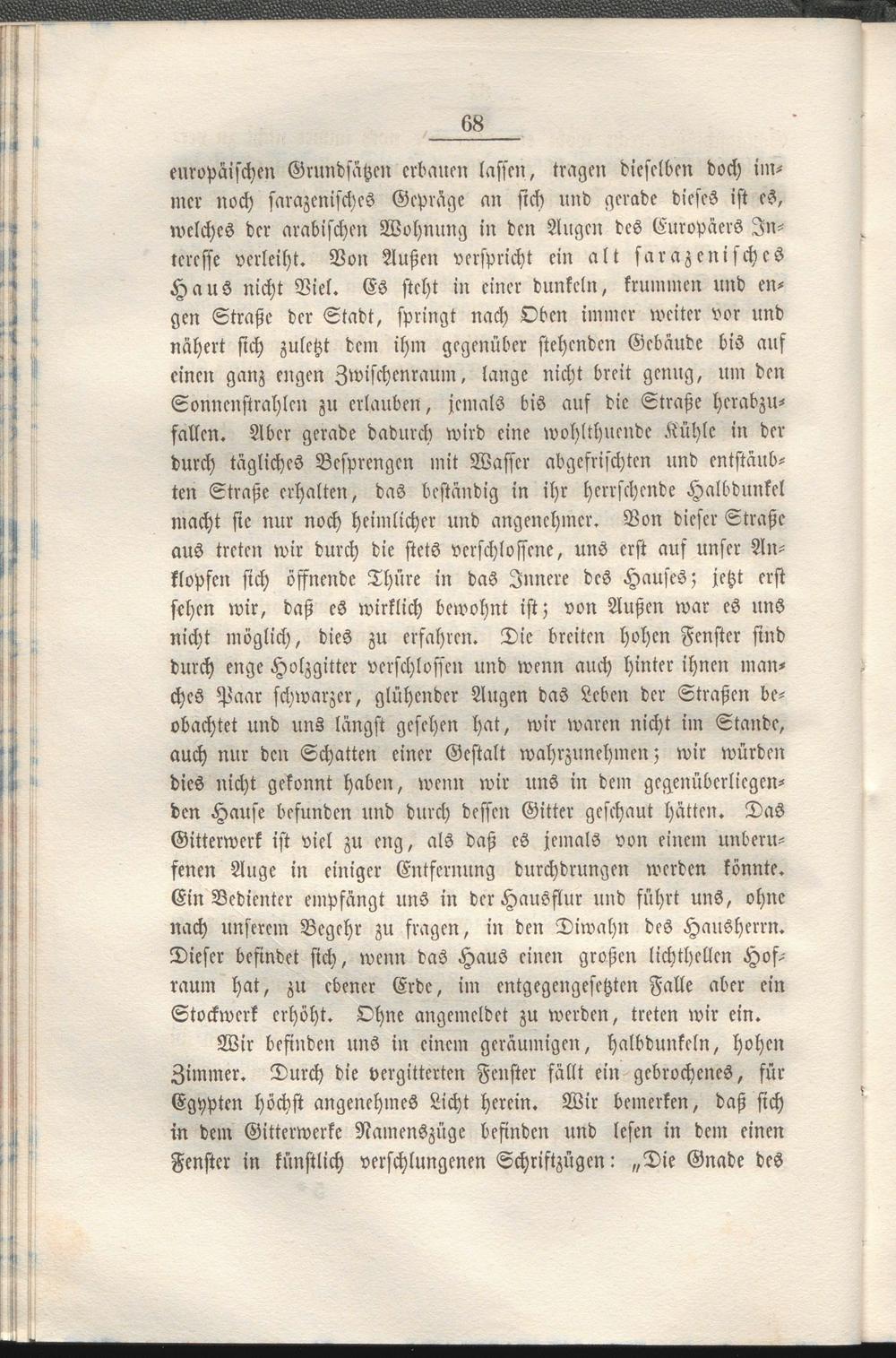 europäischen Grundsätzen erbauen lassen, tragen dieselben doch immer noch sarazenisches Gepräge an sich und gerade dieses ist es, welches der arabischen Wohnung in den Augen des Europäers Interesse verleiht. Von Außen verspricht ein alt sarazenisches Haus nicht Viel. Es steht in einer dunkeln, krummen und engen Straße der Stadt, springt nach Oben immer weiter vor und nähert sich zuletzt dem ihm gegenüber stehenden Gebäude bis auf einen ganz engen Zwischenraum, lange nicht breit genug, um den Sonnenstrahlen zu erlauben, jemals bis auf die Straße herabzufallen. Aber gerade dadurch wird eine wohlthuende Kühle in der durch tägliches Besprengen mit Wasser abgcfrischtcn und entstäubten Straße erhalten, das beständig in ihr herrschende Halbdunkel macht sie nur noch heimlicher und angenehmer. Bon dieser Straße aus treten wir durch die stets verschlossene, uns erst auf unser Anklopfen sich öffnende Thüre in das Innere des Hauses; jetzt erst sehen wir, daß es wirklich bewohnt ist; von Außen war es uns nicht möglich, dies zu erfahren. Die breiten hohen Fenster sind durch enge Holzgitter verschlossen und wenn auch hinter ihnen manches Paar schwarzer, glühender Augen das Leben der Straßen beobachtet und uns längst gesehen hat, wir waren nicht im Stande, auch nur den Schatten einer Gestalt wahrzunehmen; wir würden dies nicht gekonnt haben, wenn wir uns in dem gegenüberliegenden Hause befunden und durch dessen Gitter geschaut hätten. DaS Gitterwerk ist viel zu eng, als daß es jemals von einem unberufenen Auge in einiger Entfernung durchdrungen werden könnte. Ein Bedienter empfängt uns in der Hausflur und führt uns, ohne nach unserem Begehr zu fragen, in den Diwahn des Hausherrn. Dieser befindet sich, wenn das Haus einen großen lichthcllcn Hofraum hat, zu ebener Erde, im entgegengesetzten Falle aber ein Stockwerk erhöht. Ohne angemeldet zu werden, treten wir ein.