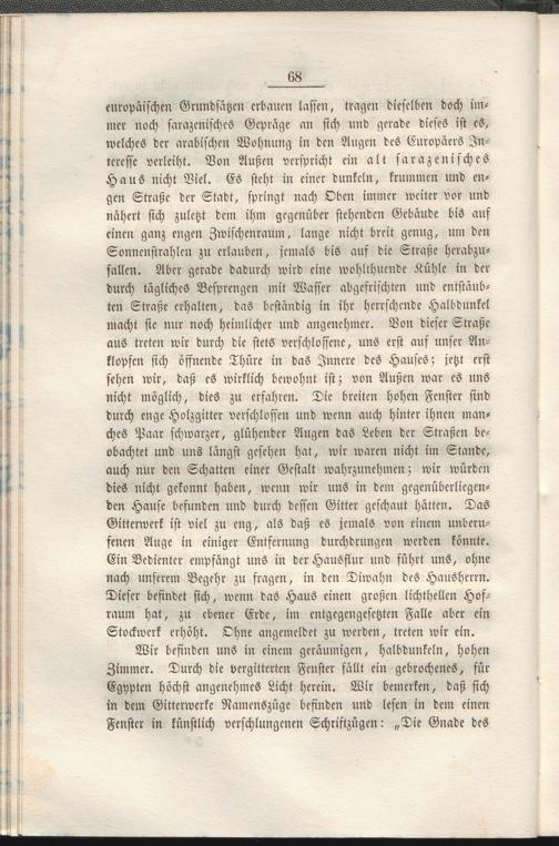 Wir befinden uns in einem geräumigen, halbdunkcln, hohen Zimmer. Durch die vergitterten Fenster fällt ein gebrochenes, für Egyptcn höchst angenehmes Licht herein. Wir bemerken, daß sich in dem Gitterwerke Namenszüge befinden und lesen in dem einen Fenster in künstlich verschlungenen Schriftzügen: „Die Gnade des