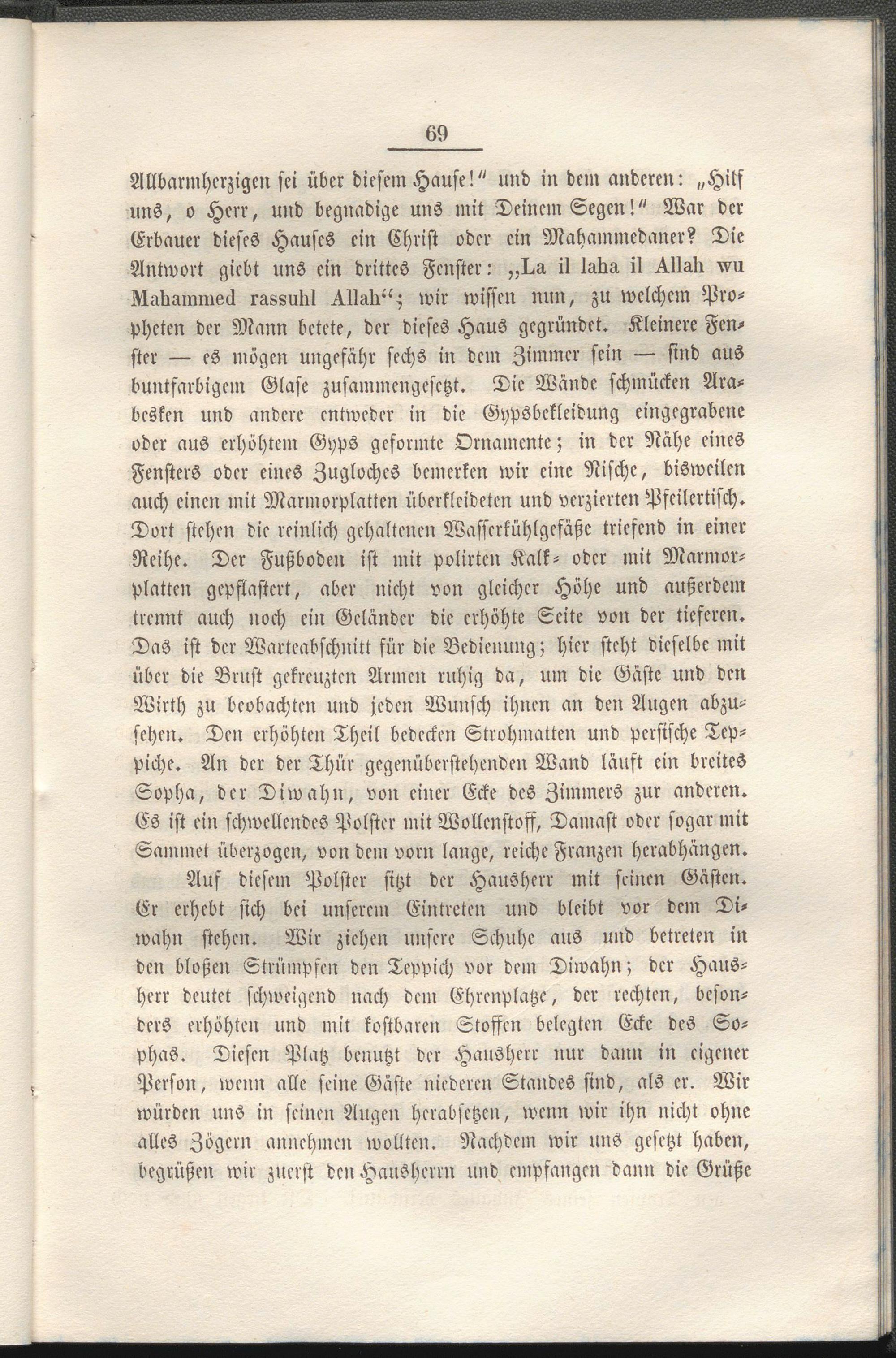 Auf diesem Polster sitzt der Hausherr mit seinen Gästen. Er erhebt sich bei unserem Eintreten und bleibt vor dem Diwahn stehen. Wir ziehen unsere Schuhe aus uud betreten in den bloßen Strümpfen den Teppich vor dem Diwahn; der Hausherr deutet schweigend nach dem Ehrenplätze, der rechten, besonders erhöhten und mit kostbaren Stoffen belegten Ecke des So- phas. Diesen Platz benutzt der Hausherr nur dann in eigener Person, wenn alle seine Gäste niederen Standes sind, als er. Wir würden uns in seinen Augen herabsetzen, wenn wir ihn nicht ohne alles Zögern annehmen wollten. Nachdem wir uns gesetzt haben, begrüßen wir zuerst den Hausherrn und empfangen dann die Grüße