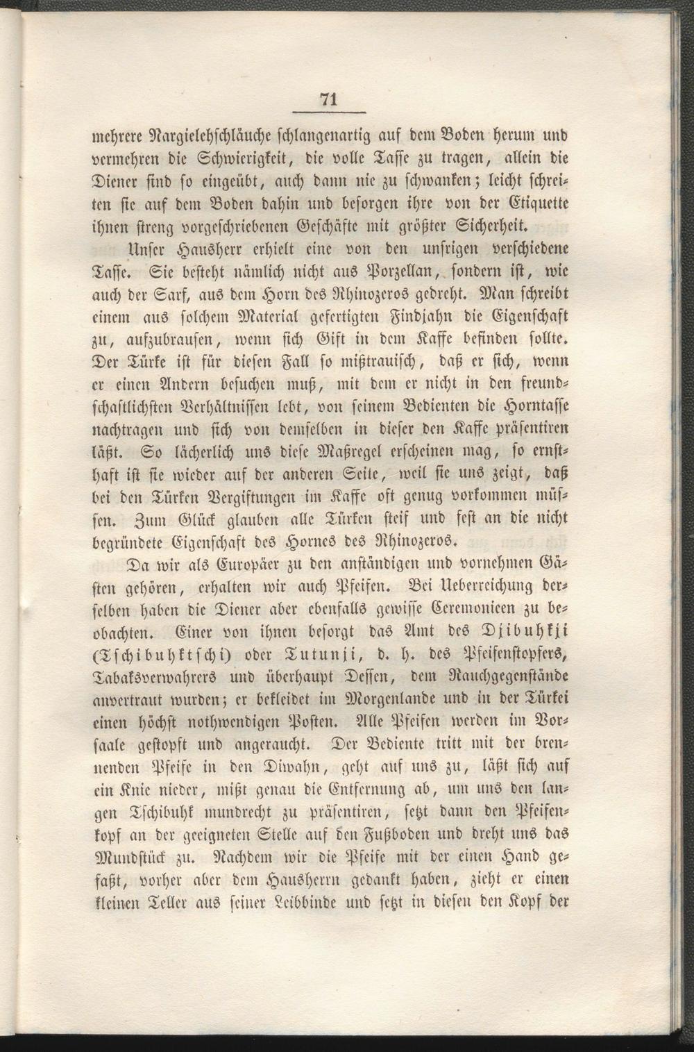 Unser Hausherr erhielt eine von den unsrigcn verschiedene Tasse. Sie besteht nämlich nicht aus Porzellan, sondern ist, wie auch der Sarf, aus dem Horn des Rhinozeros gedreht. Man schreibt einem aus solchem Material gefertigten Findjahn die Eigenschaft zu, aufzubrausen, wenn sich Gift in dem Kasse befinden sollte. Der Türke ist für diesen Fall so mißtrauisch, daß er sich, wenn er einen Andern besuchen muß, mit dem er nicht in den freundschaftlichsten Verhältnissen lebt, von seinem Bedienten die Horntasse nachtragen und sich von demselben in dieser den Kasse präscntircn läßt. So lächerlich uns diese Maßregel erscheinen mag, so ernsthaft ist sie wieder auf der anderen Seite, weil sie uns zeigt, daß bei den Türken Vergiftungen im Kasse oft genug vorkommen müssen. Zum Glück glauben alle Türken steif und fest an die nicht begründete Eigenschaft des Hornes des Rhinozeros.