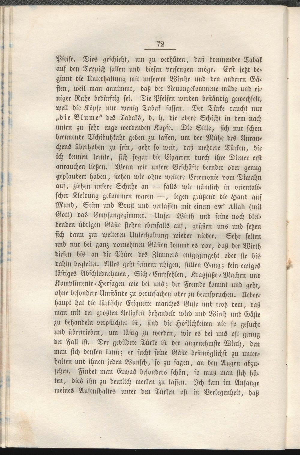 Pfeife. Dies geschieht, um zu verhüten, daß brennender Tabak auf den Teppich fallen und diesen versengen möge. Erst jetzt beginnt die Unterhaltung mit unserem Wirthe und den anderen Gästen, weil man annimmt, daß der Neuangekommene müde und einiger Ruhe bedürftig sei. Die Pfeifen werden beständig gewechselt, weil die Köpfe nur wenig Tabak fassen. Der Türke raucht nur „die Blume" des Tabaks, d. h. die obere Schicht in dem nach unten zu sehr enge werdenden Kopfe. Die Sitte, sich nur schon brennende Tschibuhkaht geben zu lassen, um der Mühe des Anrau- chens überhoben zu sein, geht so weit, daß mehrere Türken, die ich kennen lernte, sich sogar die Cigarren durch ihre Diener erst anrauchen ließen. Wenn wir unsere Geschäfte beendet oder genug geplaudert haben, stehen wir ohne weitere Ceremonie vom Diwahn auf, ziehen unsere Schuhe an — falls wir nämlich in orientalischer Kleidung gekommen waren —, legen grüßend die Hand auf Mund, Stirn und Brust und verlassen mit einem erv' Ulall (mit Gott) das Empfangszimmer. Unser Wirth und seine noch bleibenden übrigen Gäste stehen ebenfalls auf, grüßen uns und setzen sich dann zur weiteren Unterhaltung wieder nieder. Sehr selten und nur bei ganz vornehmen Gästen kommt es vor, daß der Wirth diesen bis an die Thüre des Zimmers entgegengeht oder sie bis dahin begleitet. Alles geht seinem uhigen, stillen Gang; kein ewiges lästiges Abschiednehmcn, Sich - Empfehlen, Kratzfüße - Machen und Komplimente-Hersagen wie bei uns; der Fremde kommt und geht, ohne besondere Umstände zu verursachen oder zu beanspruchen. Ueber- haupt hat die türkische Etiquette manches Gute und trotz dem, daß man mit der größten Artigkeit behandelt wird und Wirth und Gäste zu behandeln verpflichtet ist, sind die Höflichkeiten nie so gesucht und übertrieben, um lästig zu werden, wie es bei uns oft genug der Fall ist. Der gebildete Türke ist der angenehmste Wirth, den man sich denken kann; er sucht seine Gäste bestmöglichst zu unterhalten und ihnen jeden Wunsch, so zu sagen, an den Augen abzusehen. Findet man Etwas besonders schön, so muß man sich hüten, dies ihn zu deutlich merken zu lassen. Ich kam im Anfange meines Aufenthaltes unter den Türken oft in Verlegenheit, daß