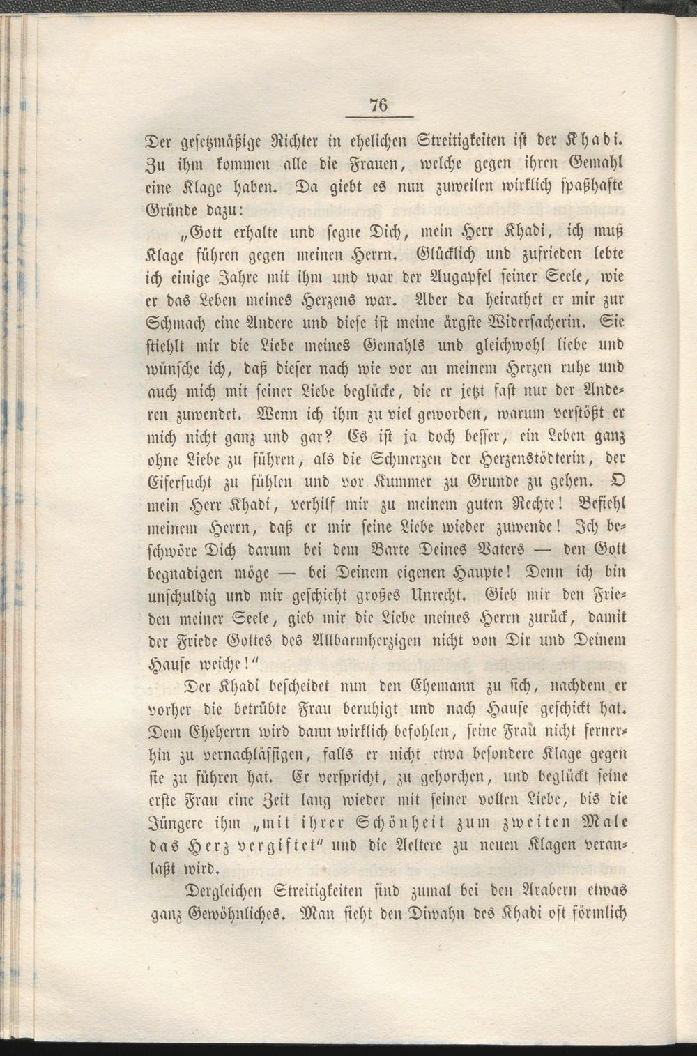 Der gesetzmäßige Richter in ehelichen Streitigkeiten ist der Khadi. Zu ihm kommen alle die Frauen, welche gegen ihren Gemahl eine Klage haben. Da giebt es nun zuweilen wirklich spaßhafte Gründe dazu: