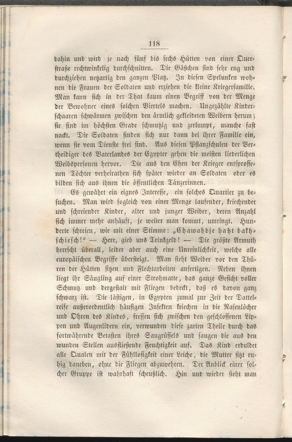 derte schreien, wie mit einer Stimme: „Chawahdje haht bakh- schiesch!" — Herr, gieb uns Trinkgeld! — Die größte Armuth herrscht überall, leider aber auch eine Unreinlichkeit, welche alle europäischen Begriffe übersteigt. Man sieht Weiber vor den Thüren der Hütten sitzen und Flechtarbeiten anfertigen. Neben ihnen liegt ihr Säugling auf einer Strohmatte, das ganze Gesicht voller Schmutz und dergestalt mit Fliegen bedeckt, daß es davon ganz schwarz ist. Die lästigen, in Egypten zumal zur Zeit der Dattel- reife außerordentlich häufigen Insekten kriechen in die Nasenlöcher und Ohren des Kindes, fressen sich zwischen den geschlossenen Lippen und Augenlidern ein, verwunden diese zarten Theile durch das fortwährende Betasten ihres Säugrüssels und saugen die aus den wunden Stellen ausfließende Feuchtigkeit auf. Das Kind erduldet i