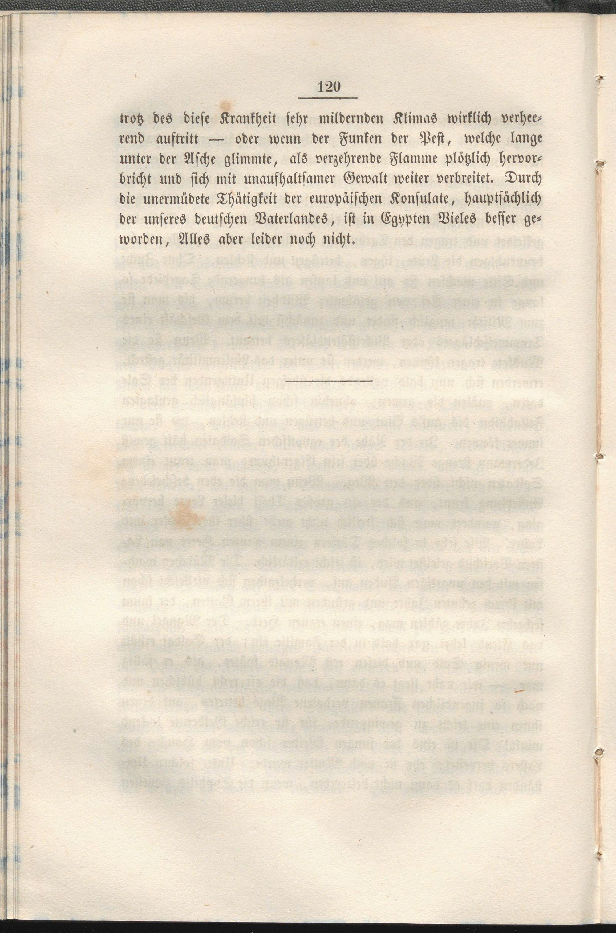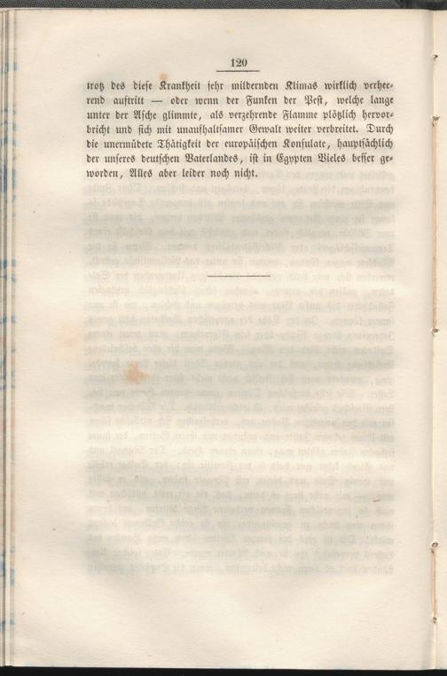 trotz des diese Krankheit sehr mildernden Klimas wirklich verheerend auftritt — oder wenn der Funken der Pest, welche lange unter der Asche glimmte, als verzehrende Flamme plötzlich hervorbricht und sich mit unaufhaltsamer Gewalt weiter verbreitet. Durch die unermüdete Thätigkeit der europäischen Konsulate, hauptsächlich der unseres deutschen Vaterlandes, ist in Egypten Vieles besser geworden, Alles aber leider noch nicht.