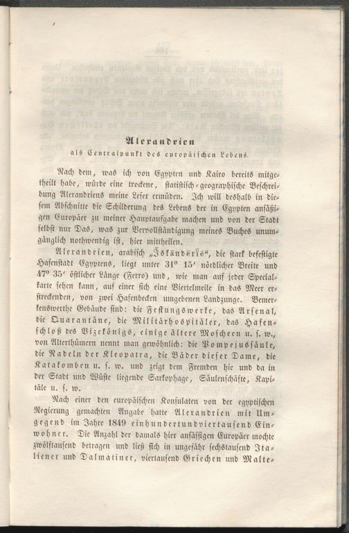 Nach dem, was ich von Egyptcn und Kairo bereits mitgetheilt habe, würde eine trockene, statistisch-geographische Beschreibung Alerandriens meine Leser ermüden. Ich will deshalb in diesem 'Abschnitte die Schilderung des Lebens der in Egyptcn ansäßi- gen Europäer zu meiner Hauptaufgabe machen und von der Stadt selbst nur Das, was zur Vervollständigung meines Buches unumgänglich nothwendig ist, hier mittheilen.