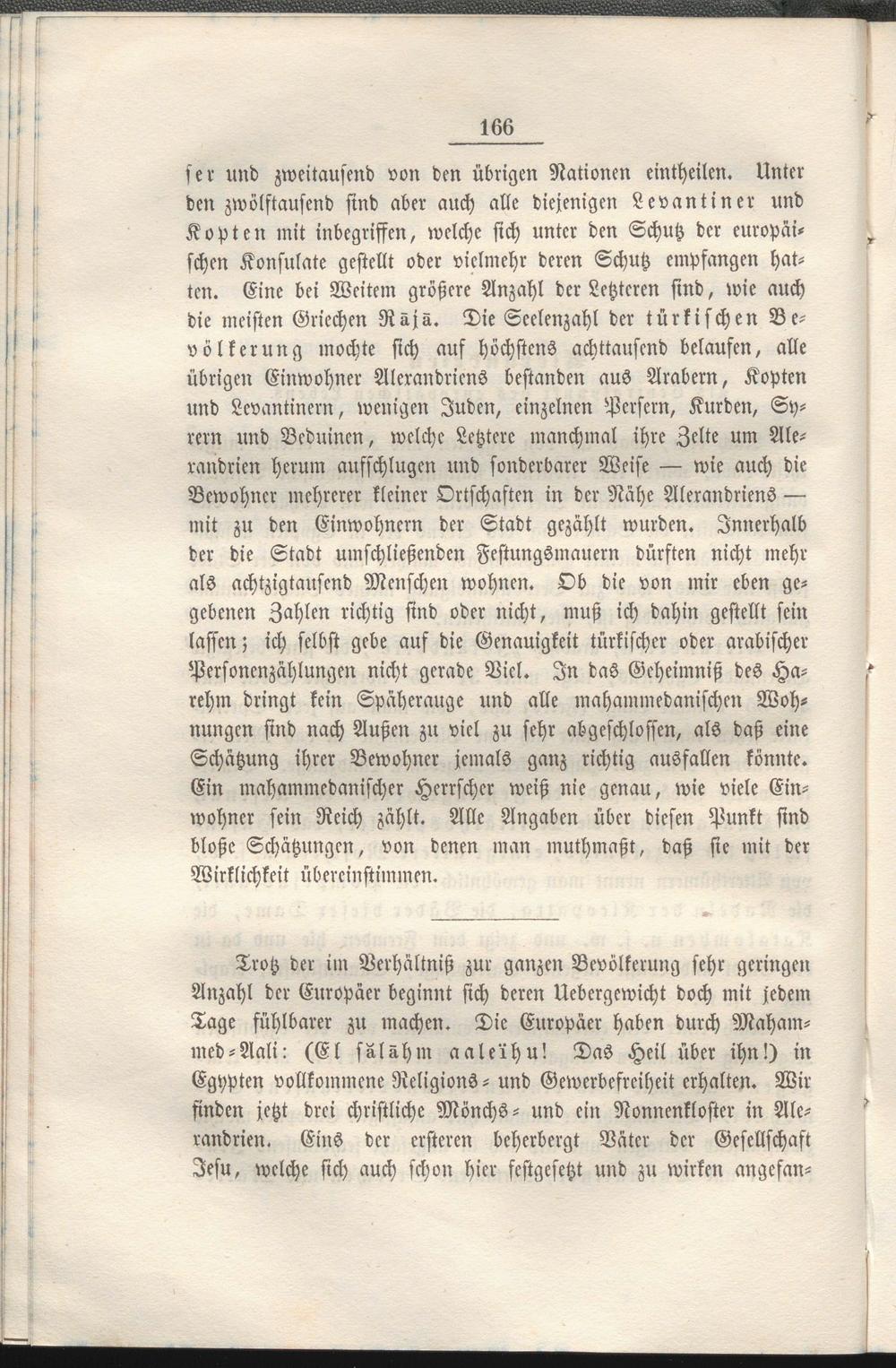 ser und zweitausend von den übrigen Nationen eintheilen. Unter den zwölftausend sind aber auch alle diejenigen Levantiner und Kopten mit Inbegriffen, welche sich unter den Schutz der europäischen Konsulate gestellt oder vielmehr deren Schutz empfangen hatten. Eine bei Weitem größere Anzahl der Letzteren sind, wie auch die meisten Griechen Räjä. Die Scelenzahl der türkischen Bevölkerung mochte sich auf höchstens achttausend belaufen, alle übrigen Einwohner Alerandriens bestanden aus Arabern, Kopten und Lcvantinern, wenigen Juden, einzelnen Persern, Kurden, Syrern und Beduinen, welche Letztere manchmal ihre Zelte um Ale- randrien herum aufschlugen und sonderbarer Weise — wie auch die Bewohner mehrerer kleiner Ortschaften in der Nähe Alerandriens — mit zu den Einwohnern der Stadt gezählt wurden. Innerhalb der die Stadt umschließenden Festungsmauern dürften nicht mehr als achtzigtauscnd Menschen wohnen. Ob die von mir eben gegebenen Zahlen richtig sind oder nicht, muß ich dahin gestellt sein lassen; ich selbst gebe auf die Genauigkeit türkischer oder arabischer Personenzählungen nicht gerade Viel. In das Geheimniß des Ha- rehm dringt kein Späherauge und alle mahammedanischen Wohnungen sind nach Außen zu viel zu sehr abgeschlossen, als daß eine Schätzung ihrer Bewohner jemals ganz richtig ausfallen könnte. Ein mahammedanischer Herrscher weiß nie genau, wie viele Einwohner sein Reich zählt. Alle Angaben über diesen Punkt sind bloße Schätzungen, von denen man muthmaßt, daß sie mit der Wirklichkeit übereinstimmen.