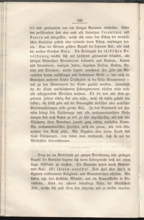 Trotz der im Verhältniß zur ganzen Bevölkerung sehr geringen Anzahl der Europäer beginnt sich deren Uebergewicht doch mit jedem Tage fühlbarer zu machen. Die Europäer haben durch Maham- med-Aali: (El sälähm aale'ihu! Das Heil über ihn!) in Egypten vollkommene Religions - und Gewerbefrciheit erhalten. Wir finden jetzt drei christliche Mönchs- und ein Nonnenkloster in Ale- randrien. Eins der ersteren beherbergt Vätcr der Gesellschaft Jesu, welche sich auch schon hier festgesetzt und zu wirken angefan-