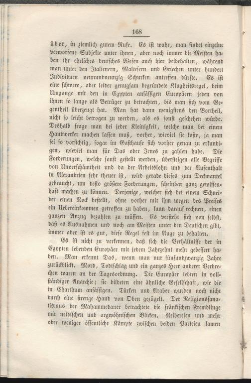 über, in ziemlich gutem Rufe. Es ist wahr, man findet einzelne verworfene Subjekte unter ihnen, aber noch immer die Meisten haben ihr ehrliches deutsches Wesen auch hier beibehalten, während man unter den Italienern, Maltesern und Griechen unter hundert Individuen neunundneunzig Schurken antreffen dürfte. Es ist eine schwere, aber leider genugsam begründete Klugheitsregel, beim Umgänge mit den in Egypten ansässigen Europäern jeden von ihnen so lange als Betrüger zu betrachten, bis man sich vom Gegentheil überzeugt hat. Man hat dann wenigstens den Vortheil, nicht so leicht betrogen zu werden, als es sonst geschehen würde. Deshalb frage man bei jeder Kleinigkeit, welche man bei einem Handwerker machen lassen muß, vorher, wieviel sie koste, ja man sei so vorsichtig, sogar im Gasthause sich vorher genau zu erkundigen, wieviel man für Das oder Jenes zu zahlen habe. Die Forderungen, welche sonst gestellt werden, übersteigen alle Begriffe von Unverschämtheit und da der Arbeitslohn und der Aufenthalt in Alerandrien sehr theuer ist, wird gerade dieses zum Deckmantel gebraucht, um desto größere Forderungen, scheinbar ganz gewissenhaft machen zu können. Derjenige, welcher sich bei einem Schneider einen Rock bestellt, ohne vorher mit ihm wegen des Preises ein Uebereinkommen getroffen zuhaben, kann darauf rechnen, einen ganzen Anzug bezahlen zu müssen. Es versteht sich von selbst, daß es Ausnahmen und noch am Meisten unter den Deutschen gibt, immer aber ist es gut, diese Regel fest im Auge zu behalten.