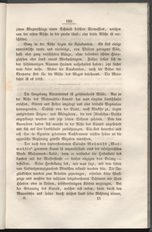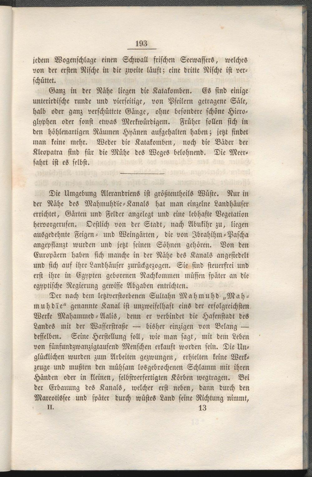 Die Umgebung Alerandriens ist größtcnthcils Wüste. Nur in der Nähe des Mahmuhdre-Kanals hat man einzelne Landhäuser errichtet, Gärten und Felder angelegt und eine lebhafte Vegetation hervorgerufen. Ocstlich von der Stadt, nach Abukihr zu, liegen ausgedehnte Feigen- und Weingärten, die von Jbrahihm-Pascha angepflanzt wurden und jetzt seinen Söhnen gehören. Von den Europäern haben sich manche in der Nähe des Kanals angesiedelt und sich auf ihre Landhäuser zurückgezogen. Sie sind steuerfrei und erst ihre in Egypten geborenen Nachkommen müssen später an die egyptische Regierung gewisse Abgaben entrichten.