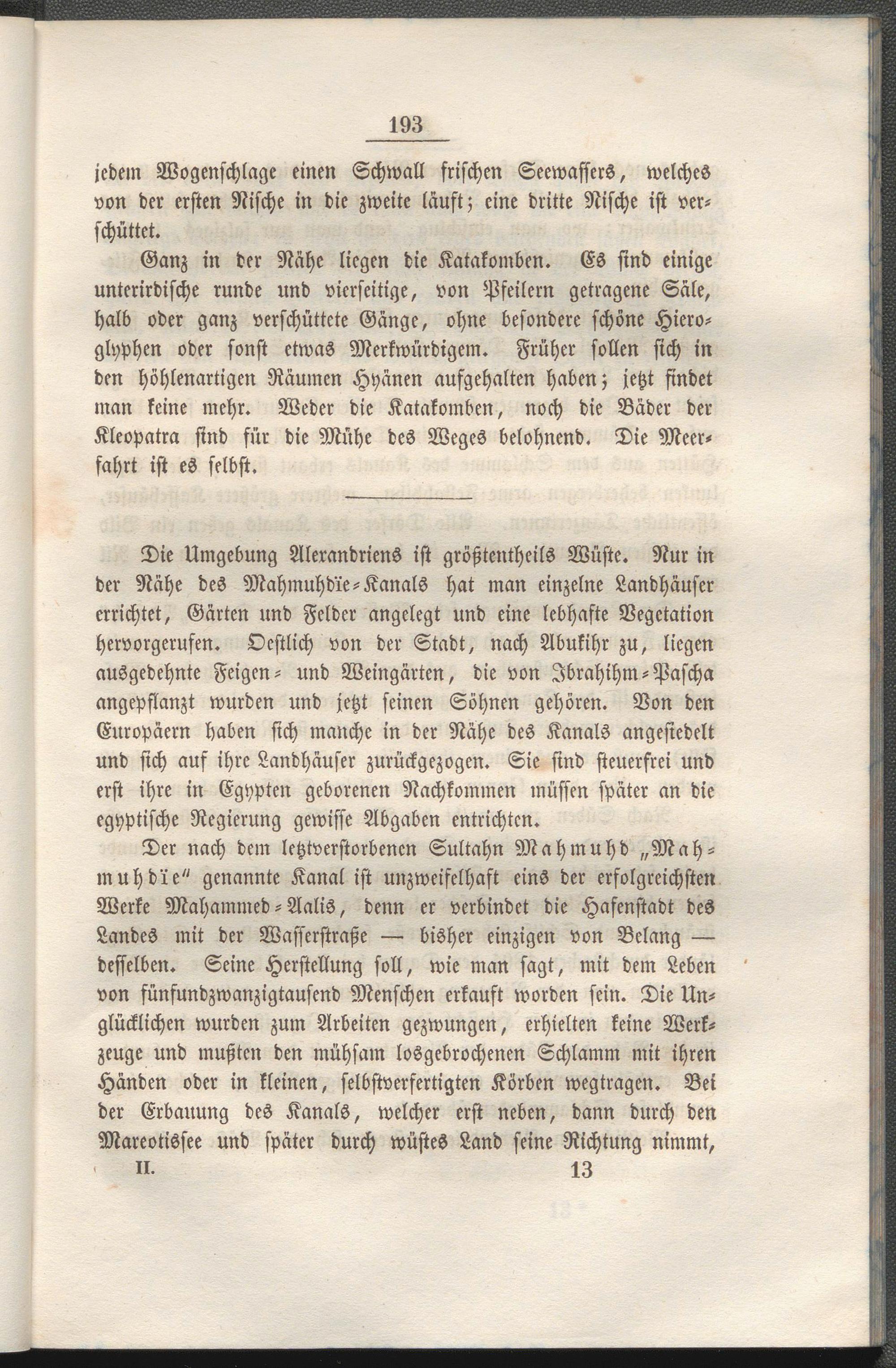Der nach dem letztvcrstorbencn Sultahn Mahmuhd „Mah- muhd'ie" genannte Kanal ist unzweifelhaft eins der erfolgreichsten Werke Mahammed-Aalis, denn er verbindet die Hafenstadt des Landes mit der Wasserstraße — bisher einzigen von Belang — desselben. Seine Herstellung soll, wie man sagt, mit dem Leben von sünfundzwanzigtausend Menschen erkauft worden sein. Die Unglücklichen wurden zum Arbeiten gezwungen, erhielten keine Werkzeuge und mußten den mühsam losgebrochenen Schlamm mit ihren Händen oder in kleinen, selbstverfertigten Körben wegtragen. Bei der Erbauung des Kanals, welcher erst neben, dann durch den Mareotissee und später durch wüstes Land seine Richtung nimmt, n 13