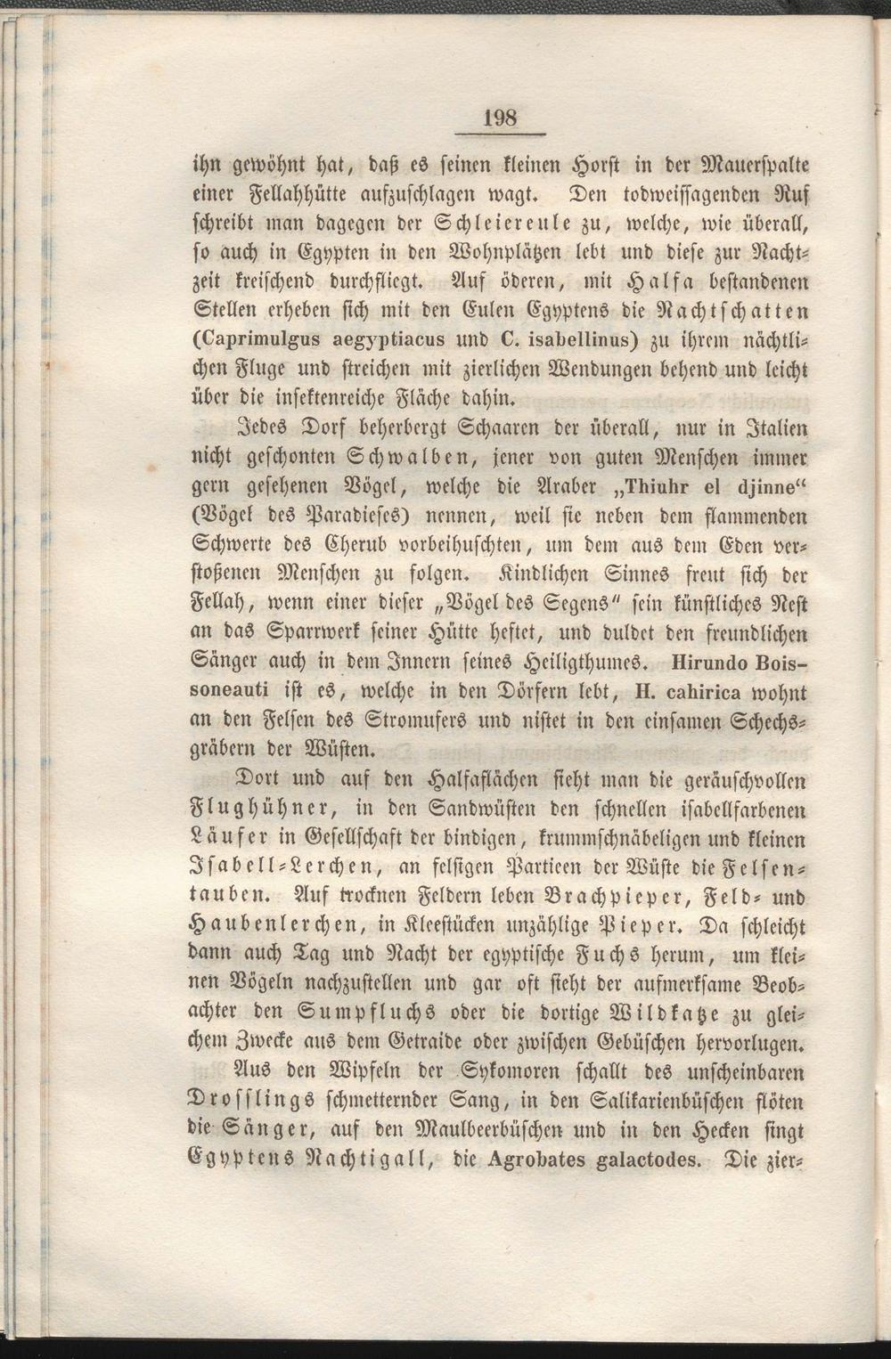 Jedes Dorf beherbergt Schaarcn der überall, nur in Italien nicht geschonten Schwalben, jener von guten Menschen immer gern gesehenen Vögel, welche die Araber „lluulki- vl ckjinnv" (Böget des Paradieses) nennen, weil sie neben dem flammenden Schwerte des Cherub vorbeihuschten, um dem aus dem Eden verstoßenen Menschen zu folgen. Kindlichen Sinnes freut sich der Fellah, wenn einer dieser „Böget des Segens" sein künstliches Nest an das Sparrwcrk seiner Hütte heftet, und duldet den freundlichen Sänger auch in dem Innern seines Hciligthumcs. kiruncko Lois- sonsAuti ist es, welche in den Dörfern lebt, H. oakiriea wohnt an den Felsen des Stromufers und nistet in den einsamen Schechs- gräbcrn der Wüsten.