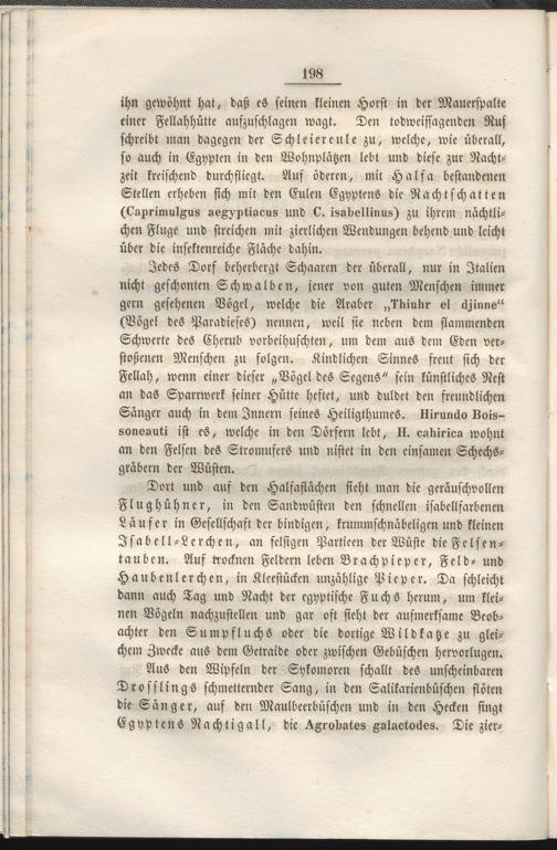 Aus den Wipfeln der Sykomoren schallt des unscheinbaren Drosslings schmetternder Sang, in den Salikarrenbüschen flöten die Sänger, auf den Maulbeerbüschen und in den Hecken singt Egyptens Nachtigall, die ^Zroliates Aalaotockes. Die zier-