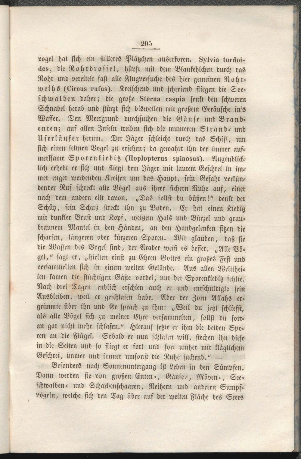 vogcl hat sich ein stilleres Plätzchen auserkoren. Svtvia turäoi- lles, die Rohrdrossel, hüpft mit dem Blaukehlchen durch das Rohr und vereitelt fast alle Flugversuche des hier gemeinen Rohrweihs (Oireus imkus). Kreischend und schreiend fliegen die See- schwalben daher; die große Sterne» es8pis senkt den schweren Schnabel herab und stürzt sich bisweilen mit großem Geräusche in'S Wasser. Den Mcergrund durchsuchen die Gänse und Brandenten; auf allen Inseln treiben sich die munteren Strand- und Uferläufer herum. Der Jäger schleicht durch das Schiff, um sich einen seltnen Vogel zu ersehen; da gewahrt ihn der immer aufmerksame Sporenkiebitz (Hop1optern8 8pmo8n8). Augenblicklich erhebt er sich und fliegt dem Jäger mit lautem Geschrei in immer enger werdenden Kreisen um das Haupt, sein Gefahr verkündender Ruf schreckt alle Vogel aus ihrer sichern Ruhe auf, einer nach dem andern eilt davon. „Das sollst du büßen!" denkt der Schütz, sein Schuß streckt ihn zu Boden. Er hat einen Kiebitz mit dunkler Brust und Kopf, weißem Hals und Bürzel und graubraunem Mantel in den Händen, an den Handgelenken sitzen die scharfen, längeren oder kürzeren Sporen. Wir glauben, daß sie die Waffen des Vogcl sind, der Araber weiß es besser. „Alle Böget," sagt er, „hielten einst zu Ehren Gottes ein großes Fest und versammelten sich in einem weiten Gelände. Aus allen Weltthei- ien kamen die flüchtigen Gäste vorbei; nur der Sporenkiebitz fehlte. Nach drei Tagen endlich erschien auch er und entschuldigte sein Ausbleiben, weil er geschlafen habe. Aber der Zorn Allahs ergrimmte über ihn und Er sprach zu ihm: „Weil du jetzt schliefst, als alle Vogel sich zu meiner Ehre versammelten, sollst du fortan gar nicht mehr schlafen." Hierauf setzte er ihm die beiden Sporen an die Flügel. Sobald er nun schlafen will, stechen ihn diese in die Seiten und so fliegt er fort und fort umher mit kläglichem Geschrei, immer und immer umsonst die Ruhe suchend." —