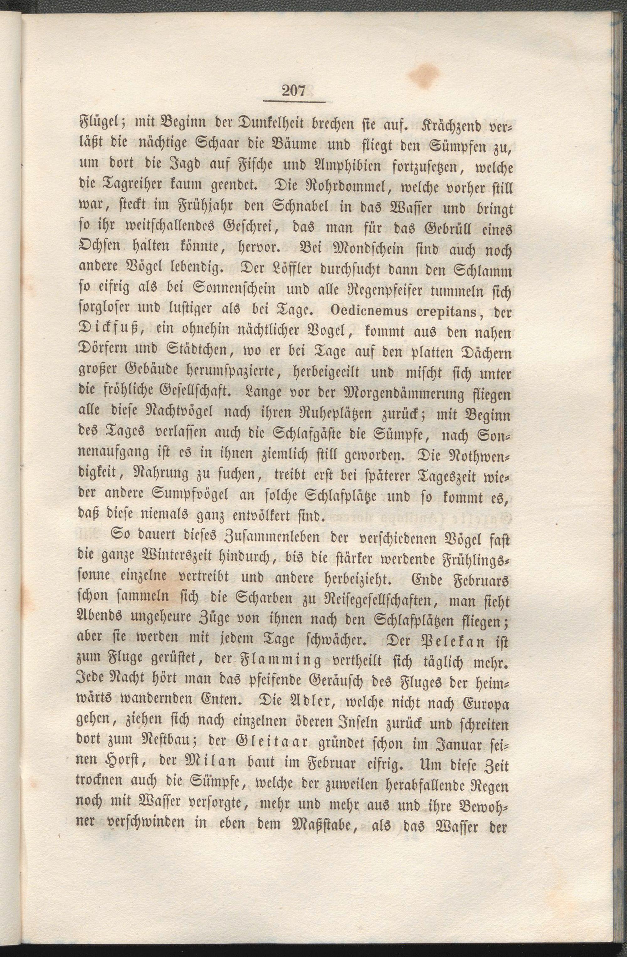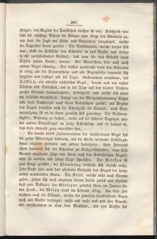 So dauert dieses Zusammenleben der verschiedenen Vogel fast die ganze Winterszeit hindurch, bis die stärker werdende Frühlingssonne einzelne vertreibt und andere herbeizieht. Ende Februars schon sammeln sich die Scharben zu Reisegesellschaften, man sieht Abends ungeheure Züge von ihnen nach den Schlafplätzen fliegen; aber sie werden mit jedem Tage schwächer. Der Pelekan ist zum Fluge gerüstet, der Fla Mining vertheilt sich täglich mehr. Jede Nacht hört man das pfeifende Geräusch des Fluges der heimwärts wandernden Enten. Die Adler, welche nicht nach Europa gehen, ziehen sich nach einzelnen öderen Inseln zurück und schreiten dort zum Nestbau; der Gleitaar gründet schon im Januar seinen Horst, der Milan baut im Februar eifrig. Um diese Zeit trocknen auch die Sümpfe, welche der zuweilen herabfallende Regen noch mit Wasser versorgte, mehr und mehr aus und ihre Bewohner verschwinden in eben dem Maßstabe, als das Wasser der