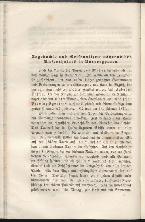 Nach der Abreise des Baron von Müller verweilte ich nur noch wenige Tage in Alerandrien. Ich wollte an den Mcnzaleh- see zurückkehren, um dort unsere bisher gemachten Sammlungen und Beobachtungen zu vervollständigen, und stand im Begriff, dahin abzureisen, als der Behörde gemeldet wurde, daß Aabahs- Pascha, der vor Kurzem zur Regierung gelangte, in Konstantinopel aber nur mit der Würde „eines Statthalters der türkischen Provinz Egypten" belehnte Vizckönig mit seinem Gefolge dem Hafen Alerandriens zusteuere. Es war am 13. Februar 1849.