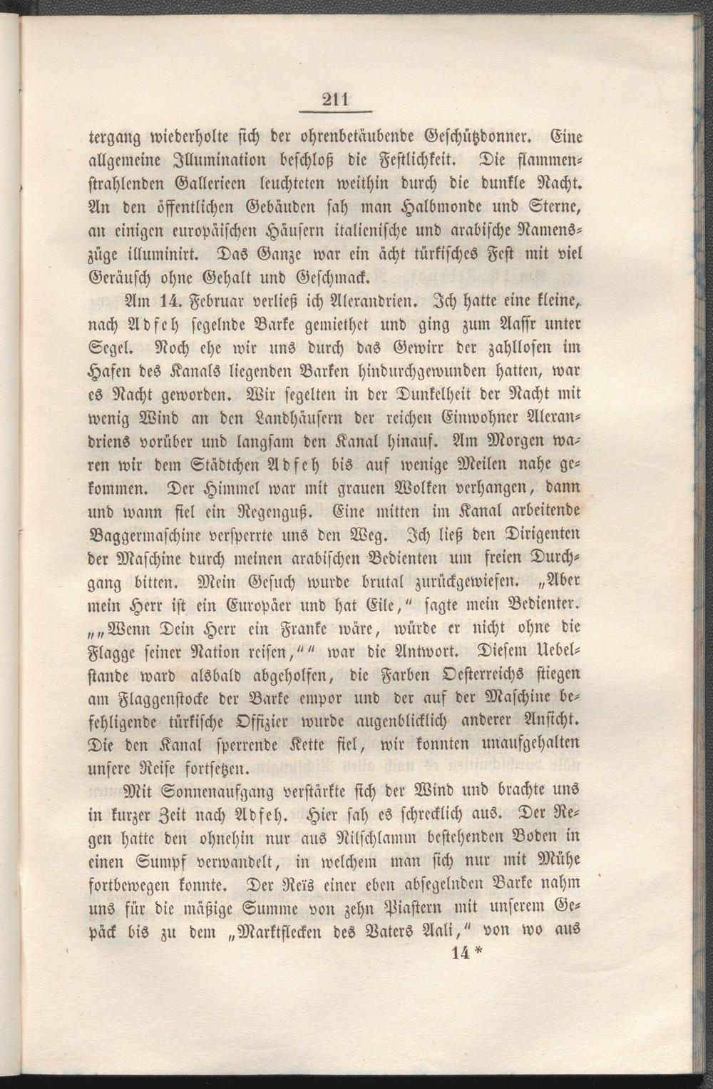 Mit Sonnenaufgang verstärkte sich der Wind und brachte uns in kurzer Zeit nach Adfch. Hier sah es schrecklich aus. Der Regen hatte den ohnehin nur aus Nilschlamm bestehenden Boden in einen Sumpf verwandelt, in welchem man sich nur mit Mühe fortbewegen konnte. Der Reis einer eben absegelnden Barke nahm uns für die mäßige Summe von zehn Piastern mit unserem Gepäck bis zu dem „Marktflecken des Vaters Aali," von wo aus