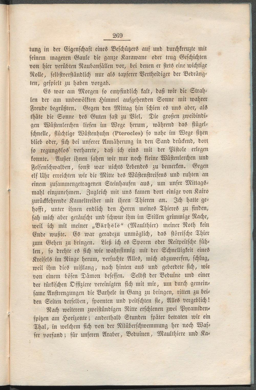 tung in der Eigenschaft eines Beschützers auf und durchkreuzte mit seinem mageren Gaule die ganze Karawane oder trug Geschichten von hier verübten Naubaufällen vor, bei denen er stets eine wichtige Rolle, selbstverständlich nur als tapferer Vertheidiger der Bedrängten, gespielt zu haben vorgab.