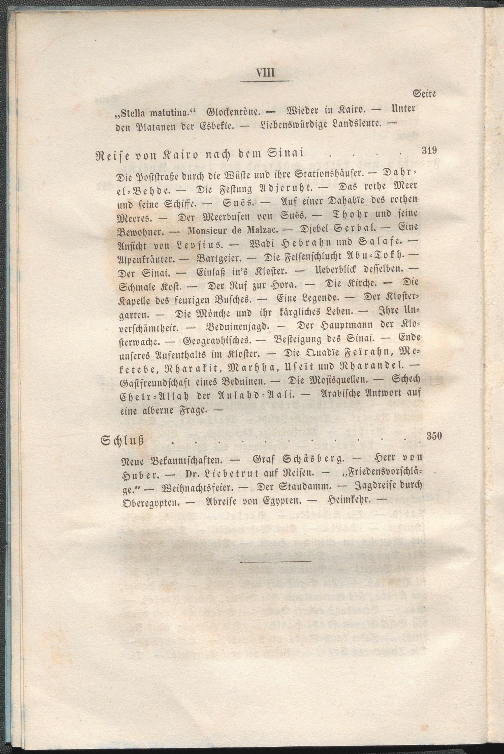 Der Sinai. — Einlaß in's Kloster. — Ueberblick desselben. — Schmale Kost. — Der Ruf zur Hora. — Die Kirche. — Die Kapelle des feurigen Busches. — Eine Legende. — Der Kloster- garten. — Die Mönche und ihr kärgliches Leben. — Ihre Unverschämtheit. — Beduinenjagd. — Der Hauptmann der Klosterwache. — Geographisches. — Besteigung des Sinai. — Ende unseres Aufenthalts im Kloster. — Die Quadte Felrahn, Me- ketebe, Rharakit, Marhha, Use'it und Rharandel. — Gastfreundschaft eines Beduinen. — Die Mosisquellen. — Schech Chelr - Allah der Aulahd - Aali. — Arabische Antwort auf eine alberne Frage. —