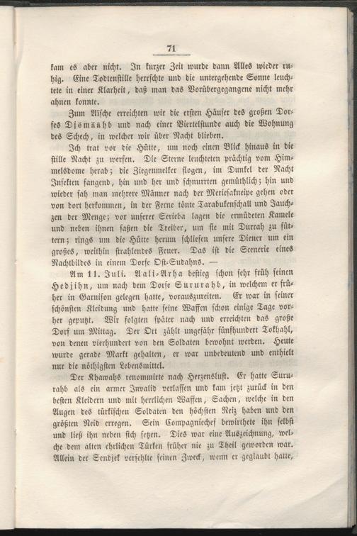 Ich trat vor die Hütte, um noch einen Blick hinaus in die stille Nacht zu werfen. Die Sterne leuchteten prächtig vom Himmelsdome herab; die Ziegenmelker flogen, im Dunkel der Nacht Insekten fangend, hin und her und schnurrten gemüthlich; hin und wieder sah man mehrere Männer nach der Mericfakneipe gehen oder von dort herkommen, in der Ferne tönte Tarabukenschall und Jauchzen der Menge; vor unserer Serieba lagen die ermüdeten Kamele und neben ihnen saßen die Treiber, um sie mit Durrah zu füttern; rings um die Hütte herum schliefen unsere Diener um ein großes, weithin strahlendes Feuer. Das ist die Scenerie eines Nachtbildcö in einem Dorfe Ost-Sudahns. —