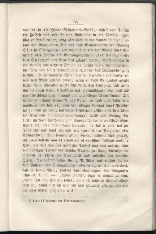 von da in die Hände Mahammed-Aali's, erhielt von Diesem die Freiheit und mit ihr eine Anstellung in der Marine. Hier stieg er schnell empor, ging aber bald in den Landdienst über, bekam den Rang eines Bei und das Gouvernement.der Provinz Eint in Obcrcgyptcn, von wo aus er mit dem Range eines Generals oder Pascha als Gencralgouvcrncur „der Königreiche des Sudahn" nach Charthum gesandt wurde. Laticf-Pascha ist ein ziemlich unterrichteter Mann; er spricht neben der arabischen, türkischen und seiner heimathlichen Sprache das Italienische ganz leiblich, ist in manchen Wissenschaften bewandert und würde gewiß weit Mehr gelernt haben, wenn er dazu Gelegenheit gehabt hätte. Sein Charakter wurde sehr verschieden beurthcibt. Ich lernte ihn als einen edlen, freigebigen und großmüthigen, aber auch als einen herrschsüchtigen, strengen und rachsüchtigen Mann kennen. Oft machte er seinem Namen ^) alle Ehre. Er gab und liebte eine Fanthasie und hielt es, ohne den übrigen Gesetzen seines Propheten zu nahe zu treten, mit Luther's Worten: „Wer nicht liebt Wein (in Charthum gilt Branntwein dafür), Weib und Gesang, der bleibt ein Narr sein Lebelang." Gewöhnlich speiste der Khadi Char- thums bei ihm; kamen dann Europäer, so lud er diese mit zur Tafel ein und trank ungenirt mit ihnen seinen Burgunder oder Champagner. Der fromme Mann betete, während dies geschah, ein „H.us billsllr min ei 8eli6!takn ei rsch'ikm" (Behüte uns, o Herr, vor dem von Dir gestürzten Teufel) nach dem andern, ohne dem sündigen Treiben des Pascha Einhalt zu thun, vielmehr ermunterte er Diesen zur Fröhlichkeit und entlockte ihm manchen Scherz. Latief präscntirtc ihm z. B. Wein und ergötzte sich an dem Entsetzen des Strenggläubigen oder versicherte ihm wiederholt, daß er keinen Wein, sondern nur Champagner oder Burgunder trinke u. d. m. — „Lieber Khadi", sagte er einmal zu ihm, „wenn Du gen Himmel fährst, halte ich mich an Deinem Khaf- tahn an, damit auch ich noch mit in's Paradies gelange, ehe dessen Thor wieder geschlossen wird."