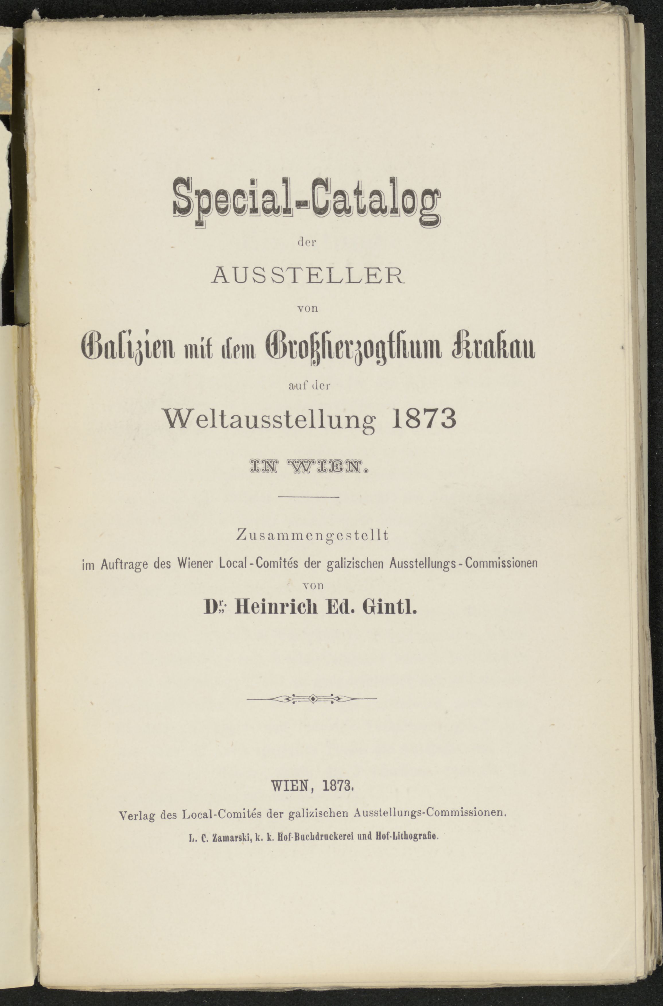 BIBL-WA134: Special-Catalog der Aussteller von Galizien mit dem Großherzogthum Krakau auf der Weltausstellung 1873 in Wien