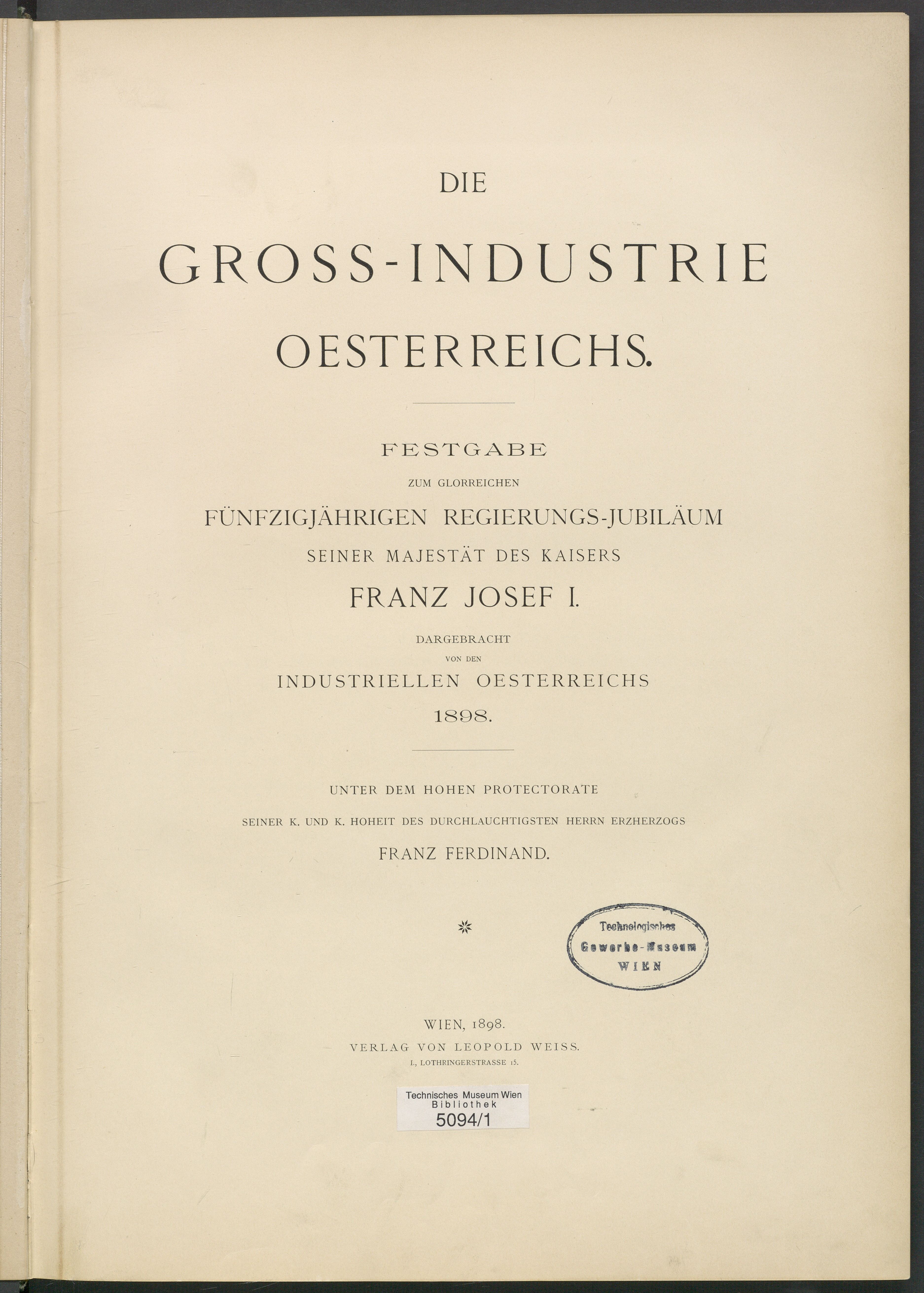 BIBL-U5094-1: Die Groß-Industrie Oesterreichs : Festgabe zum glorreichen fünfzigjährigen Regierungs-Jubiläum seiner Majestät des Kaisers Franz Josef I. dargebracht von den Industriellen Österreichs 1898 ; Erster Band