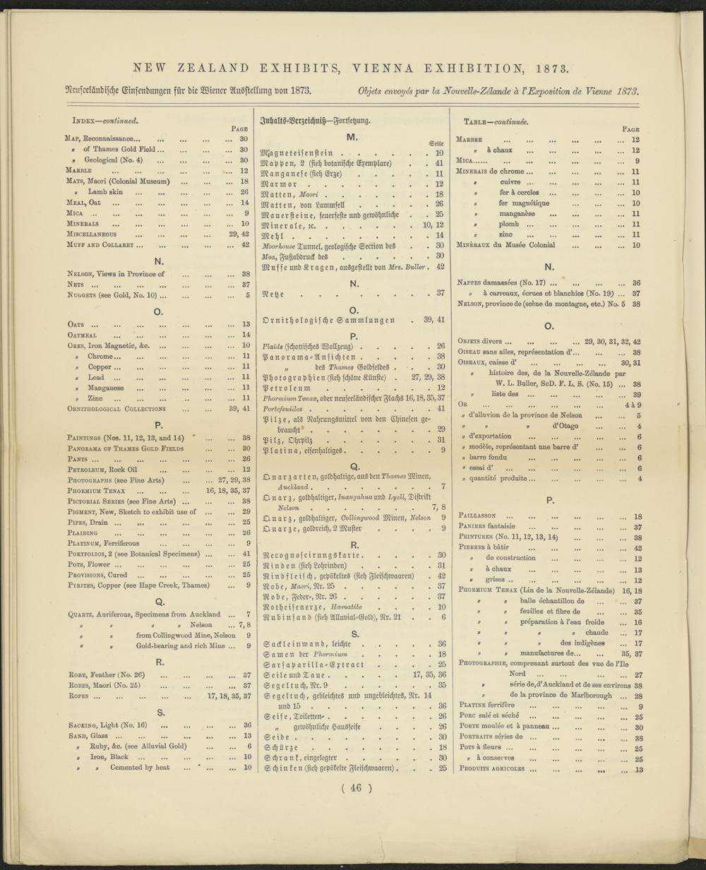 Descriptive catalogue of the exhibits in the New Zealand court of the Vienna exhibition, 1873 = Beschreibender Catalog der Neuseeländischen Abtheilung in der Wiener Ausstellung von 1873 = Catalogue descriptif des objets exposés dans la cour de la Nouvelle-Zélande à L'Exposition de Vienne 1873