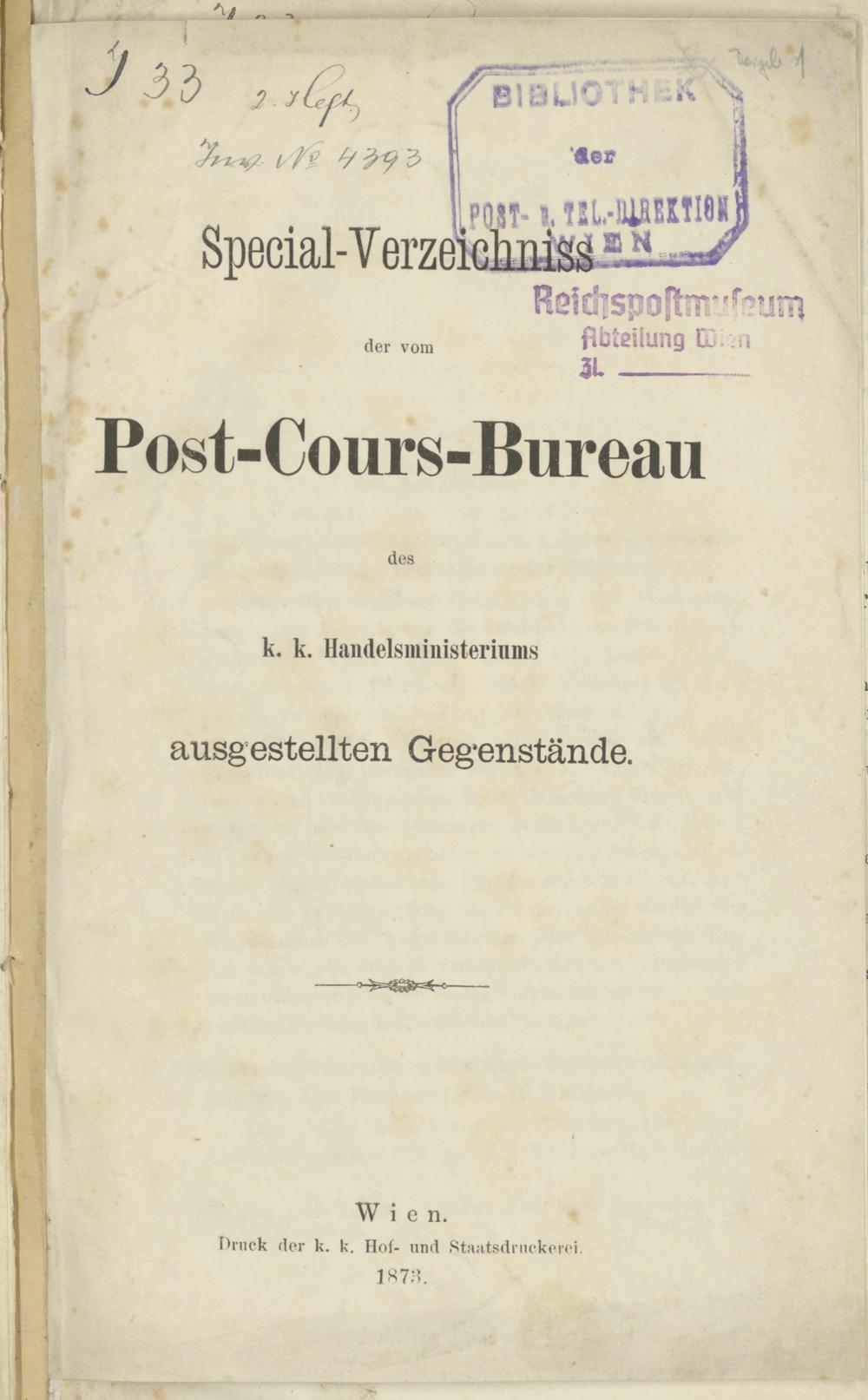 BIBL-P1458-2: Spezial-Verzeichniss der vom Post-Cours-Bureau des k. k. Handelsministeriums ausgestellten Gegenstände