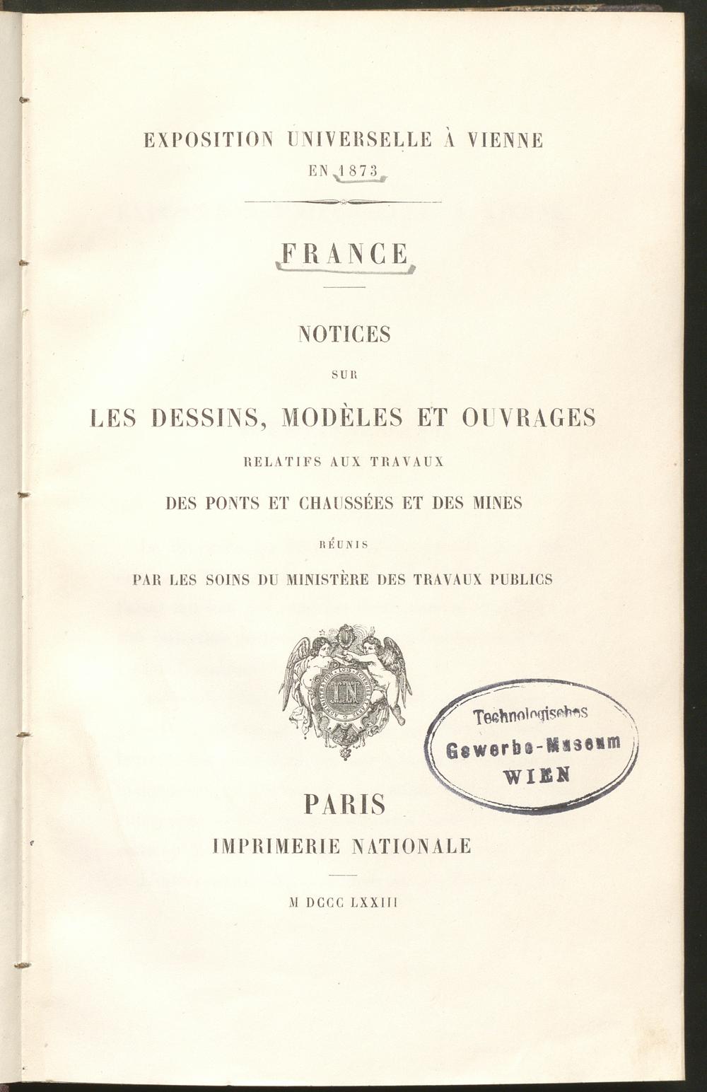 France : notices sur les dessins, modèles et ouvrages relatifs aux travaux des ponts et chaussées et des mines réunis par les soins du ministère des travaux publics ; Exposition Universelle à Vienne