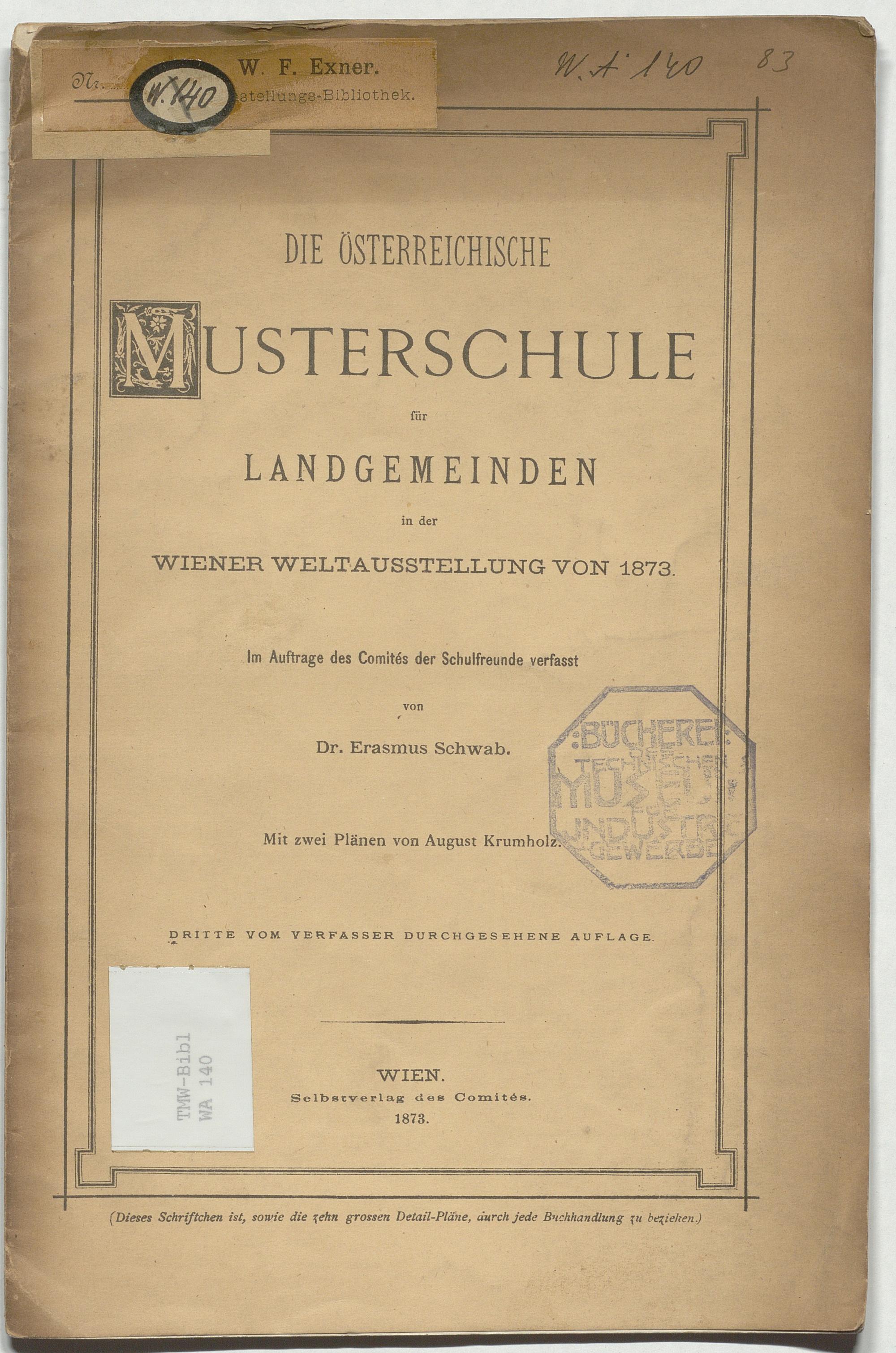 Die österreichische Musterschule für Landgemeinden in der Wiener Weltausstellung von 1873 : im Auftrage des Comités der Schulfreunde / verfasst von Erasmus Schwab. Mit zwei Plänen von August Krumholz