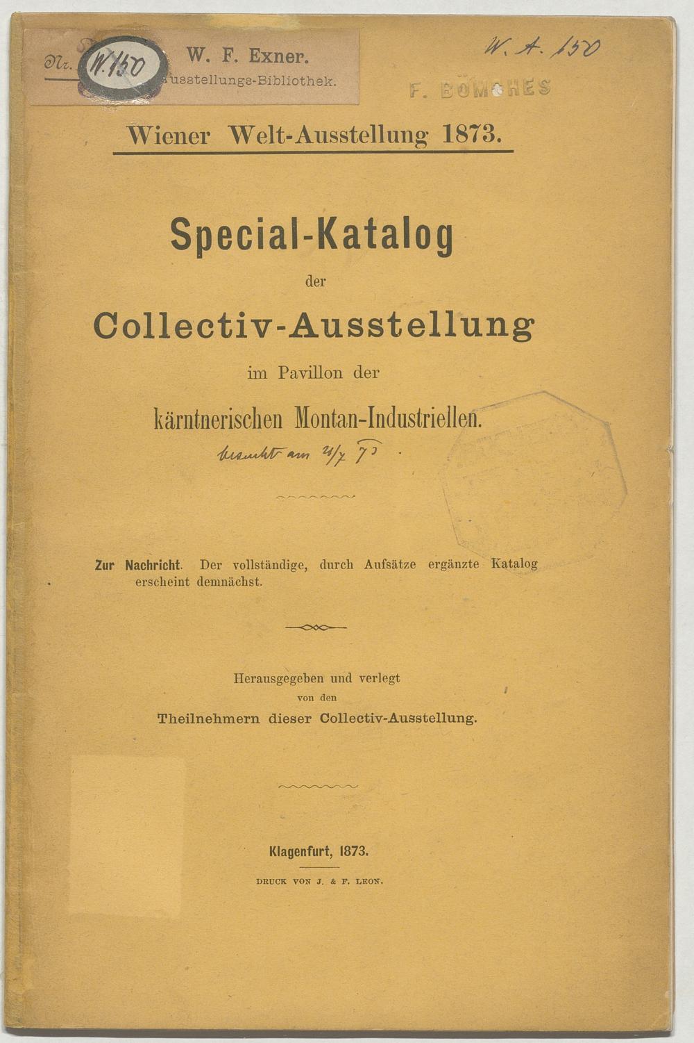 Special-Katalog der Collectiv-Ausstellung im Pavillon der kärtnerischen Montan-Industriellen : Wiener Welt-Ausstellung 1873 / herausgegeben und verlegt von den Theilnehmern dieser Collectiv-Ausstellung