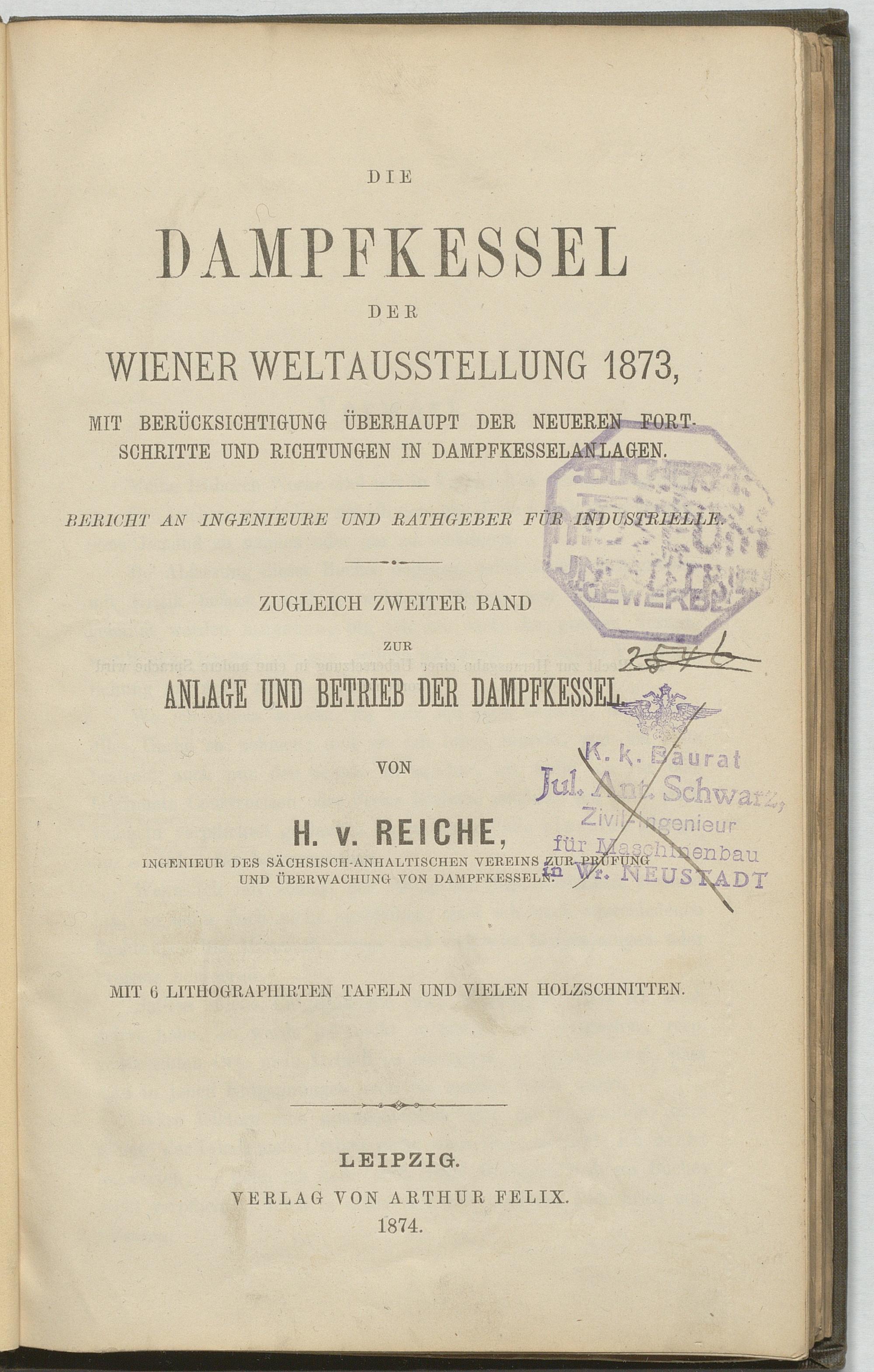 Die Dampfkessel der Wiener Weltausstellung 1873 : mit Berücksichtigung überhaupt der neueren Fortschritte und Richtungen in Dampfkesselanlagen ; Bericht an Ingenieure und Rathgeber für Industrielle / von H. von Reiche