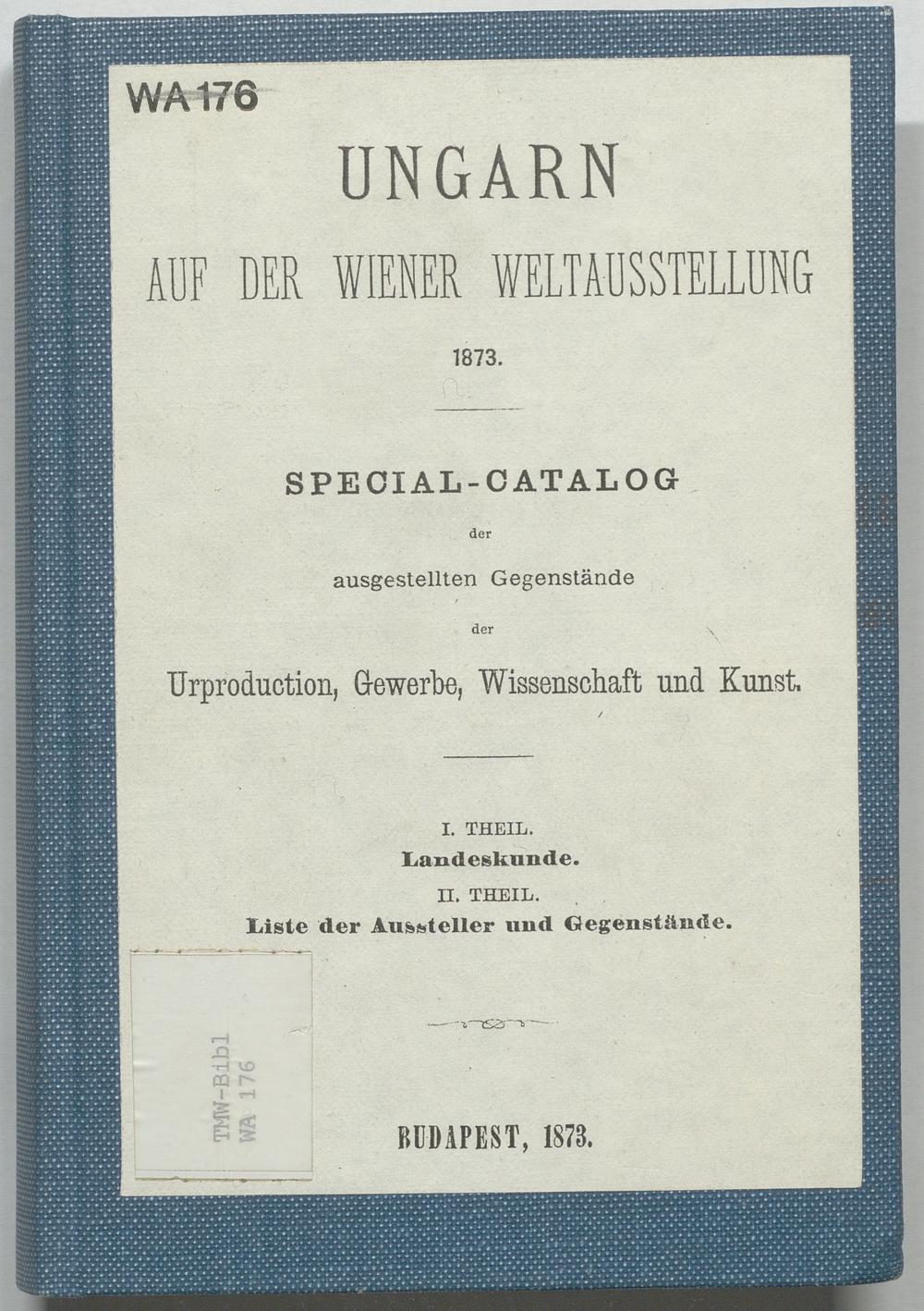 Ungarn auf der Wiener Weltausstellung 1873 : Special-Catalog der ausgestellten Gegenstände der Urproduction, Gewerbe, Wissenschaft und Kunst ; I. Theil: Landeskunde ; II. Theil: Liste der Aussteller und Gegenstände
