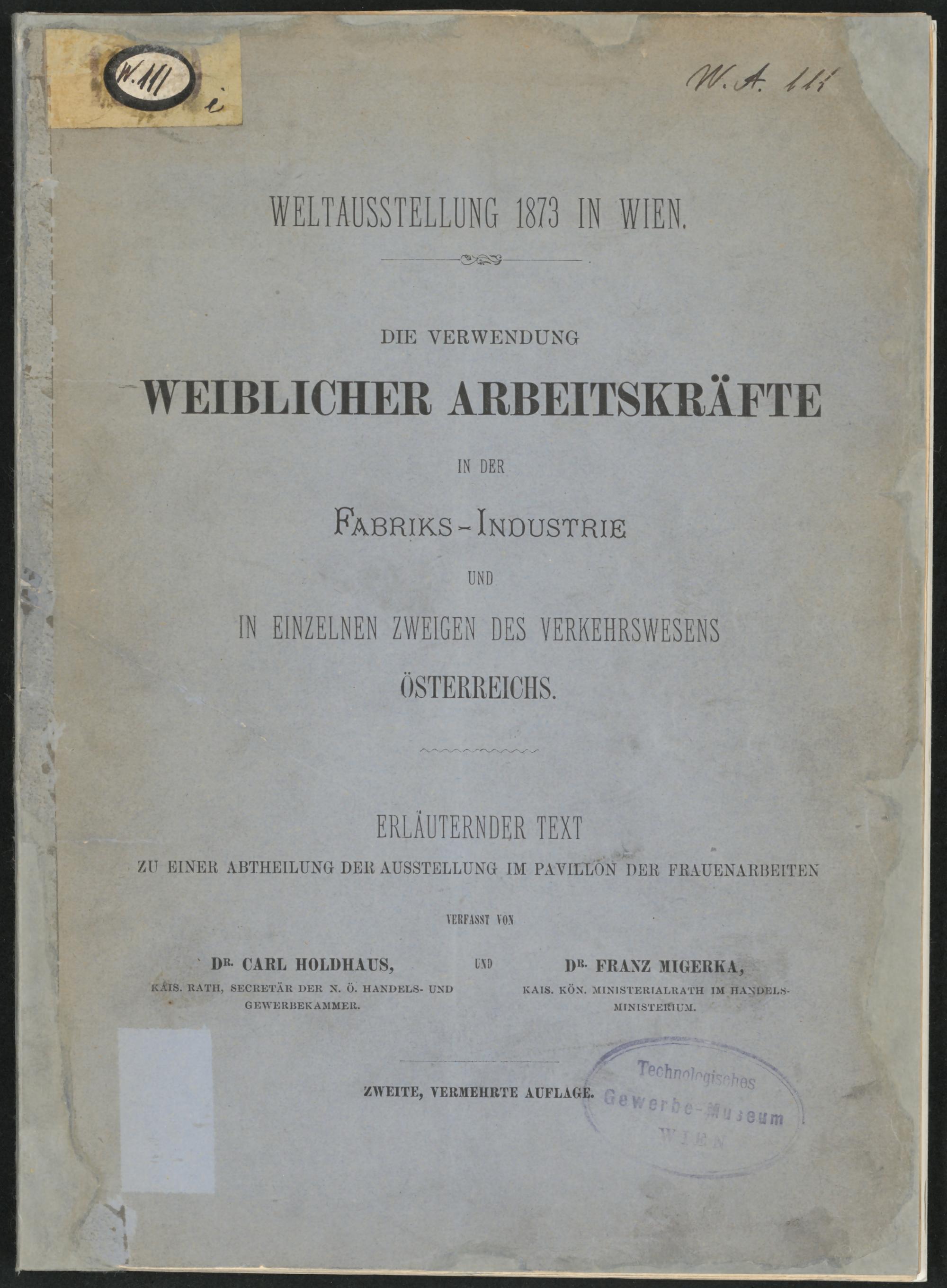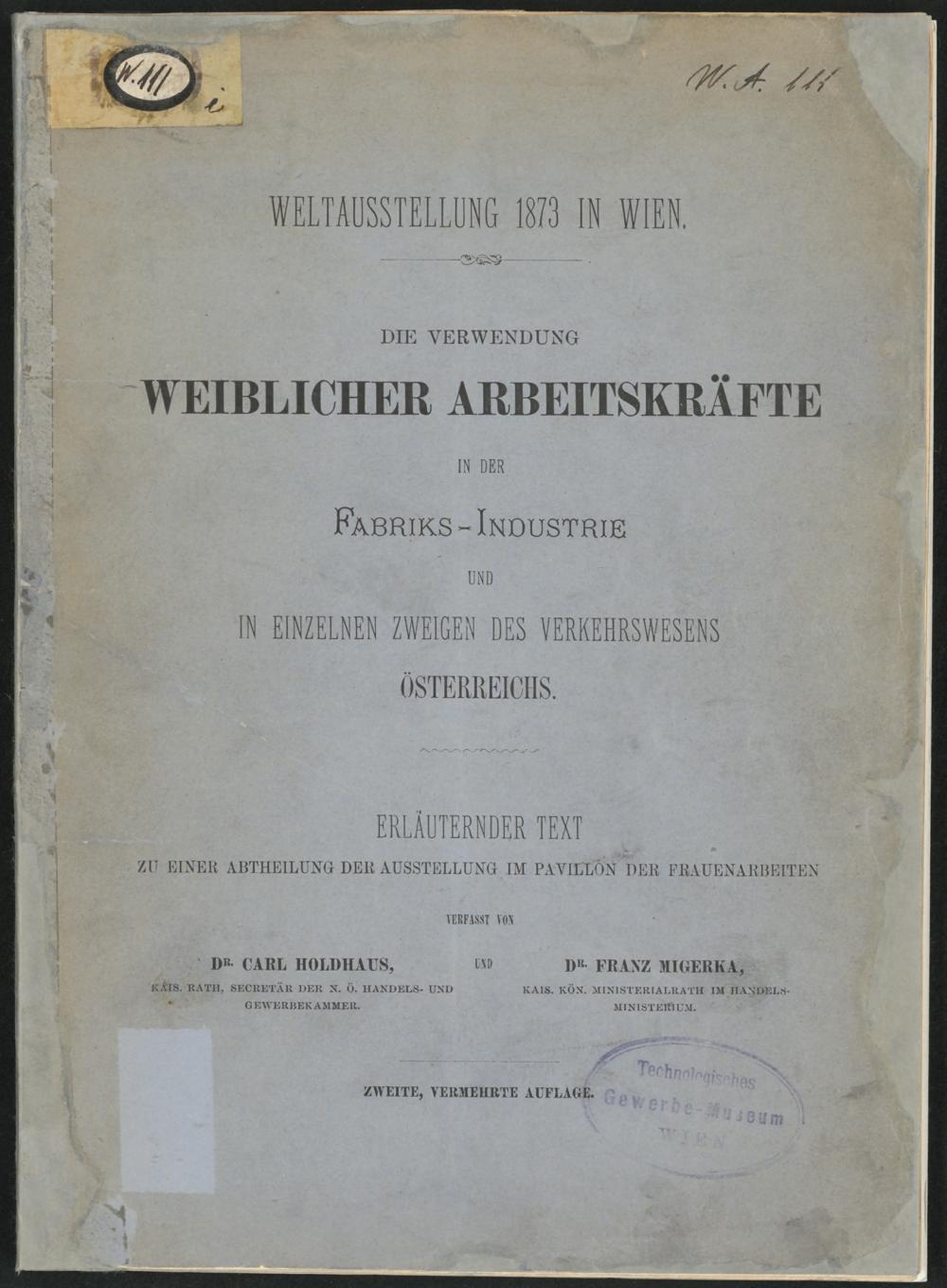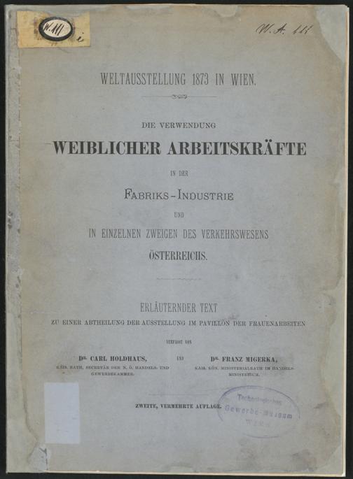 Die Verwendung weiblicher Arbeitskräfte in der Fabriks-Industrie und in einzelnen Zweigen des Verkehrswesens Österreichs : Weltausstellung 1873 in Wien ; erläuternder Text zu einer Abtheilung der Ausstellung im Frauen-Pavillon / verfasst von Carl Holdhaus und Franz Migerka
