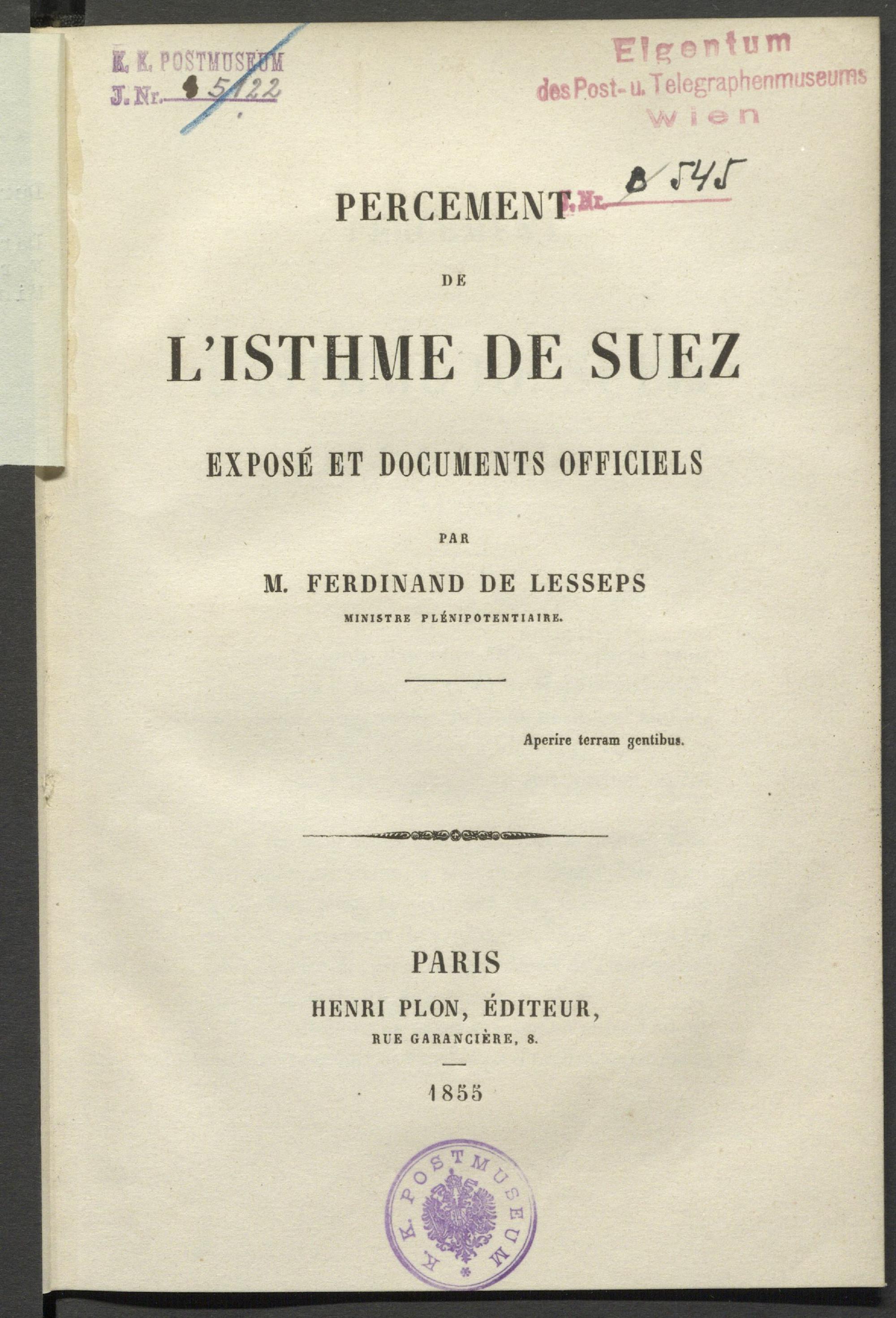 Percement de l'Isthme de Suez : exposé et documents officiels / par M. Ferdinand de Lesseps