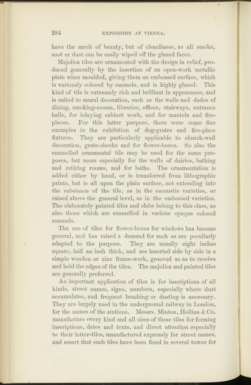 An important application of tiles is for inscriptions of all kinds, street names, signs, numbers, especially where dust accumulates, and frequent brushing or dusting is necessary. They are largely used in the underground railway in London, for the names of the stations. Messrs. Minton, Hollins & Co. manufacture every kind and all sizes of these tiles for forming inscriptions, dates and texts, and direct attention especially to their letter-tiles, manufactured expressly for street names, and assert that such tiles have been fixed in several towns for