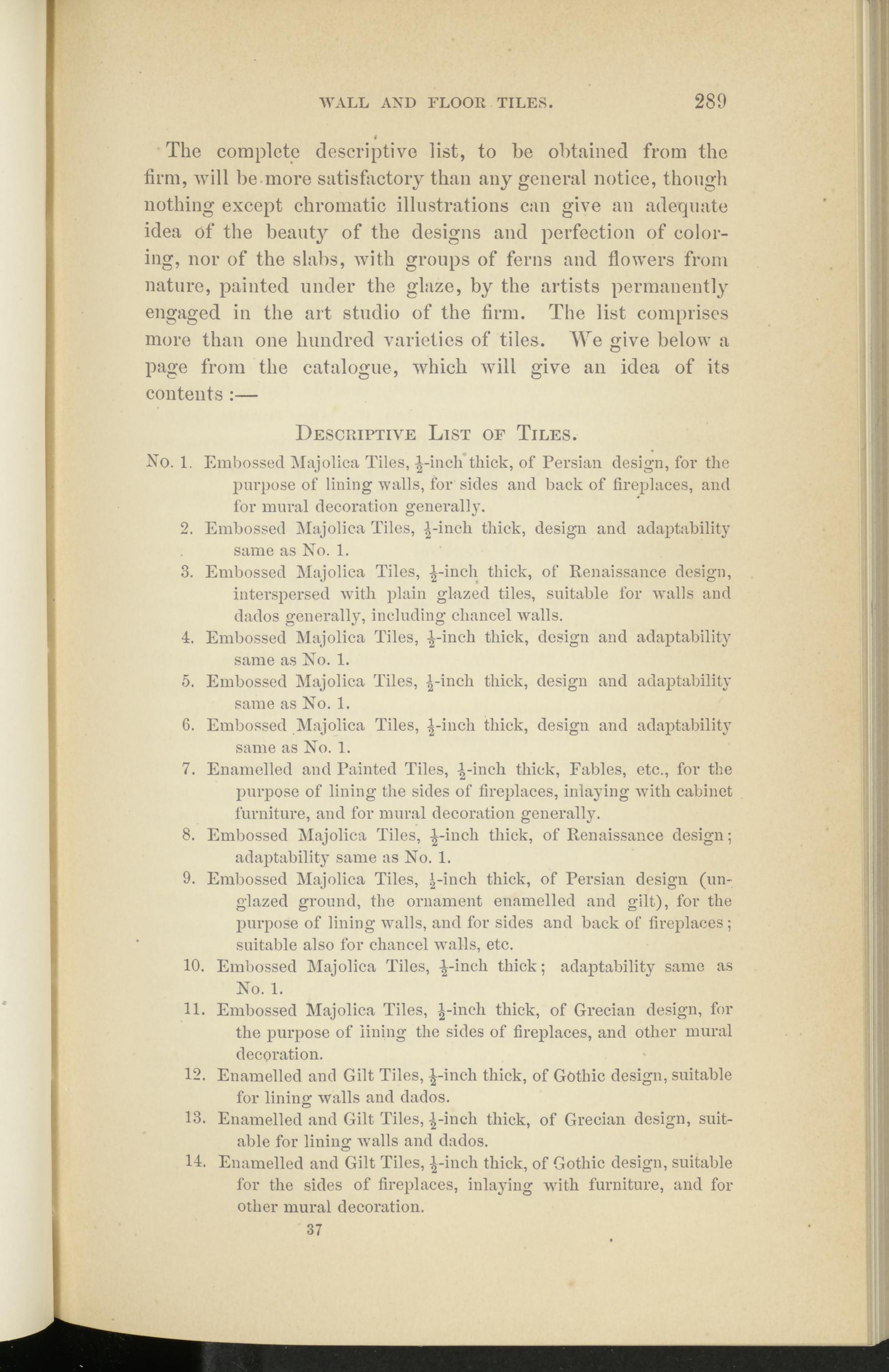 The complete descriptive list, to be obtained from the firm, will be more satisfactory than any general notice, though nothing except chromatic illustrations can give an adequate idea of the beauty of the designs and perfection of coloring, nor of the slabs, with groups of ferns and flowers from nature, painted under the glaze, by the artists permanently engaged in the art studio of the firm. The list comprises more than one hundred varieties of tiles. We give below a page from the catalogue, which will give an idea of its contents :—
