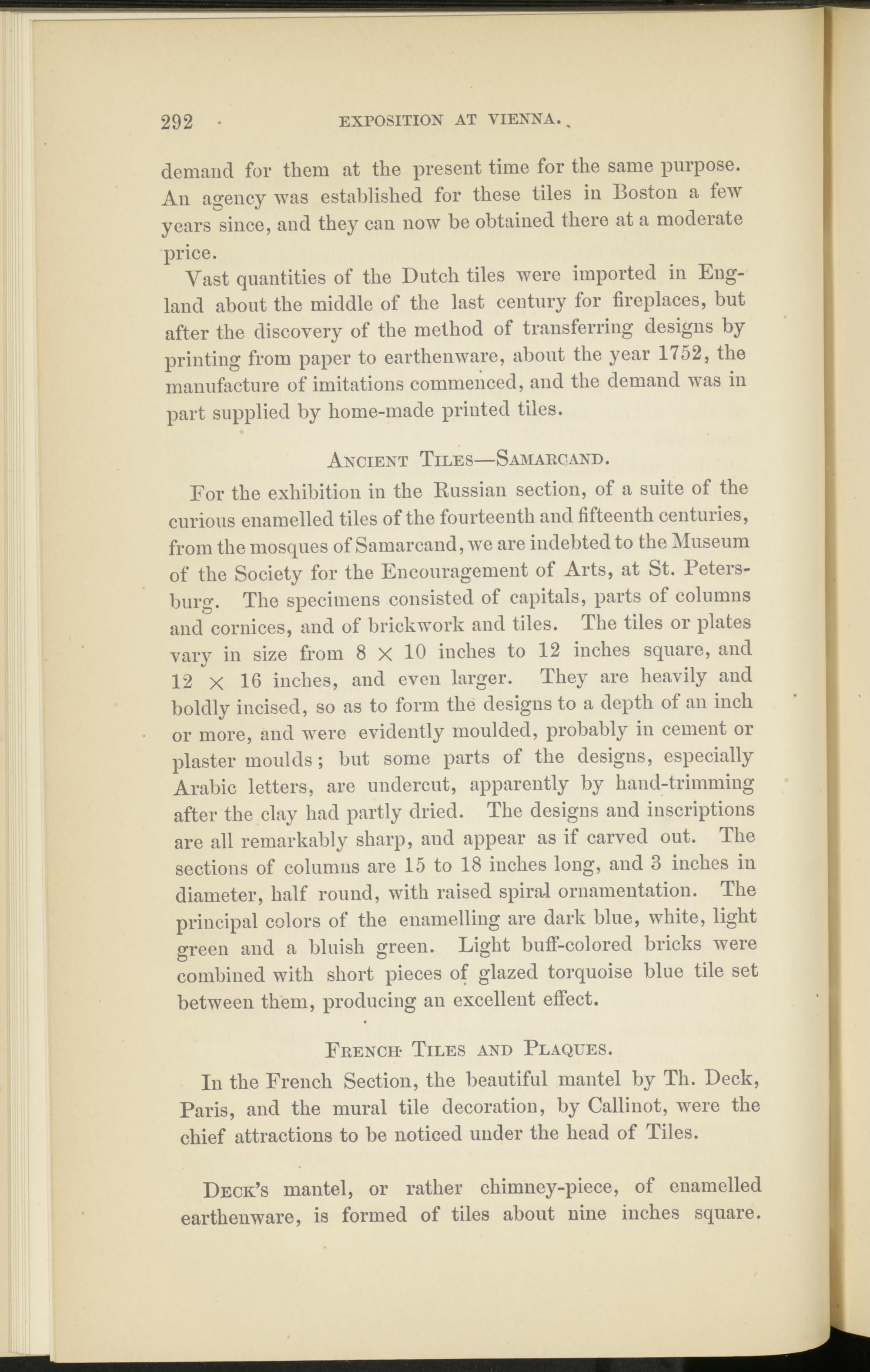 Vast quantities of the Dutch tiles were imported in Eng­land about the middle of the last century for fireplaces, but after the discovery of the method of transferring designs by printing from paper to earthenware, about the year 1752, the manufacture of imitations commenced, and the demand was in part supplied by home-made printed tiles.