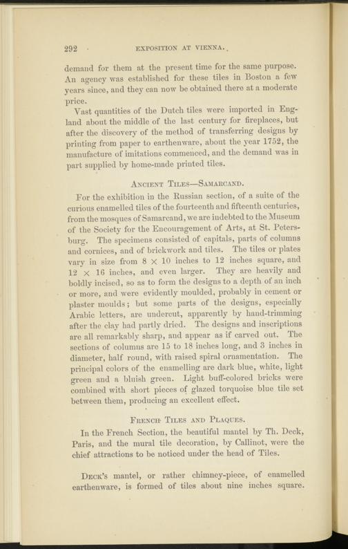 For the exhibition in the Russian section, of a suite of the curious enamelled tiles of the fourteenth and fifteenth centuries, from the mosques of Samarcand, we are indebted to the Museum of the Society for the Encouragement of Arts, at St. Peters­burg. The specimens consisted of capitals, parts of columns and cornices, and of brickwork and tiles. The tiles or plates vary in size from 8 X 10 inches to 12 inches square, and 12 X 16 inches, and even larger. They are heavily and boldly incised, so as to form the designs to a depth of an inch or more, and were evidently moulded, probably in cement or plaster moulds; but some parts of the designs, especially Arabic letters, are undercut, apparently by hand-trimming after the clay had partly dried. The designs and inscriptions are all remarkably sharp, and appear as if carved out. The sections of columns are 15 to 18 inches long, and 3 inches in diameter, half round, with raised spiral ornamentation. The principal colors of the enamelling are dark blue, white, light green and a bluish green. Light buff-colored bricks Avere combined with short pieces of glazed torquoise blue tile set between them, producing an excellent effect.