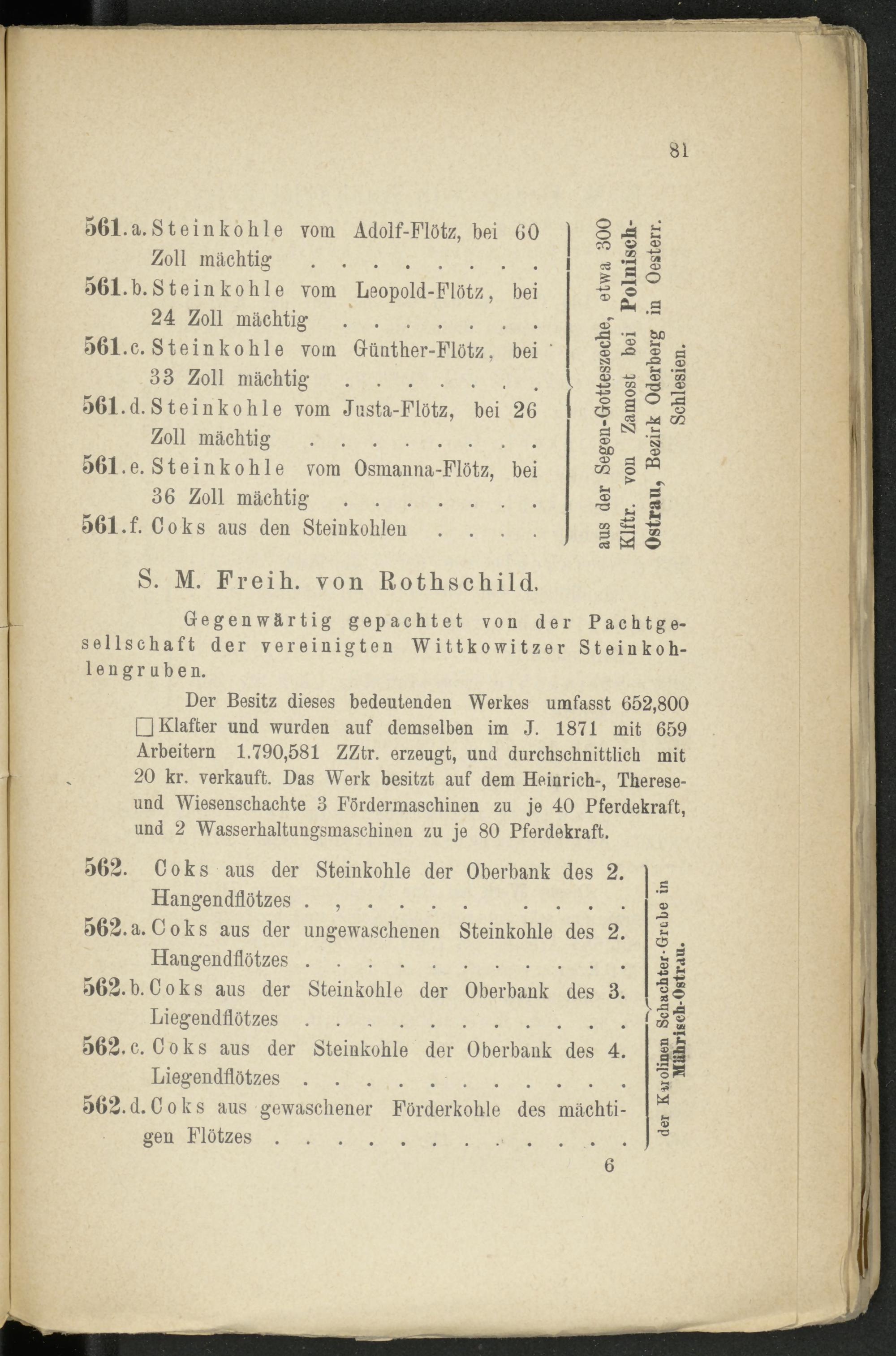 Der Besitz dieses bedeutenden Werkes umfasst 652,800 □ Klafter und wurden auf demselben im J. 1871 mit 659 Arbeitern 1.790,581 ZZtr. erzeugt, und durchschnittlich mit 20 kr. verkauft. Das Werk besitzt auf dem Heinrich-, Therese- und Wiesenschachte 3 Fördermaschinen zu je 40 Pferdekraft, und 2 Wasserhaltungsmaschinen zu je 80 Pferdekraft.