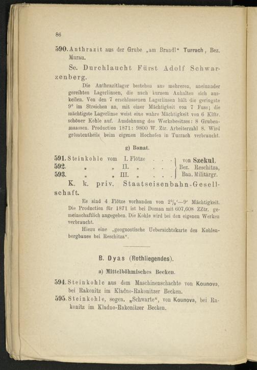 Die Anthrazitlager bestehen aus mehreren, aneinander gereihten Lagerlinsen, die nach kurzem Anhalten sich auskeilen. Von den 7 erschlossenen Lagerlinsen hält die geringste 9° im Streichen an, mit einer Mächtigkeit von 7 Fass; die mächtigste Lagerlinse weist eine wahre Mächtigkeit von 6 Klftr. schöner Kohle auf. Ausdehnung des Werksbesitzes: 8 Gruben- maassen. Production 1871: 9800 W. Ztr. Arbeiterzahl 8. Wird grösstentheik beim eigenen Hochofen in Turrach verbraucht.