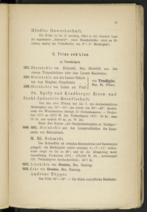Hiezu drei Karten „der Steinkohlenbergbau zu Tradigist.“ 600.601. Steinkohle aus den Lunzer schichten der Anna- zeche von Schrambach.