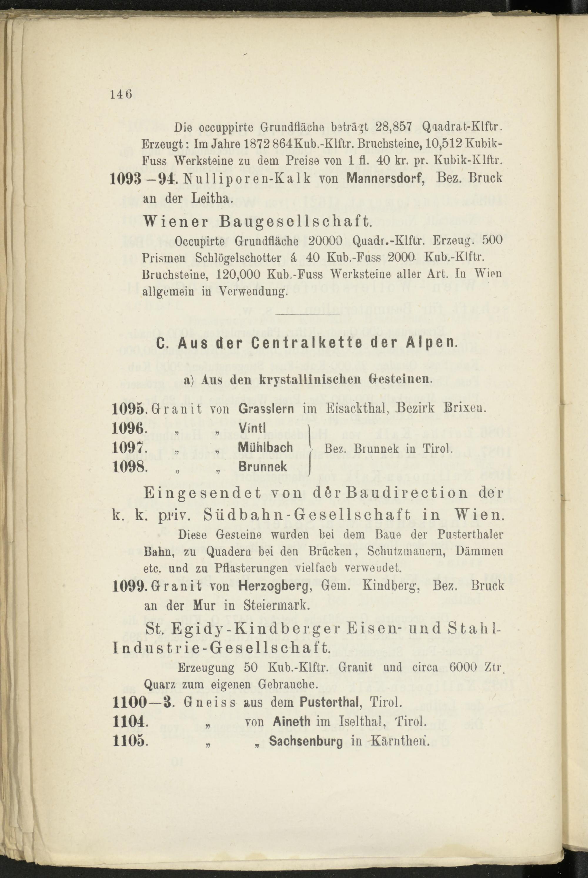 Diese Gesteine wurden bei dem Baue der Pusterthaler Bahn, zu Quadern bei den Brucken, Schutz mauern, Dämmen etc. und zu Pflasterungen vielfach verwendet.