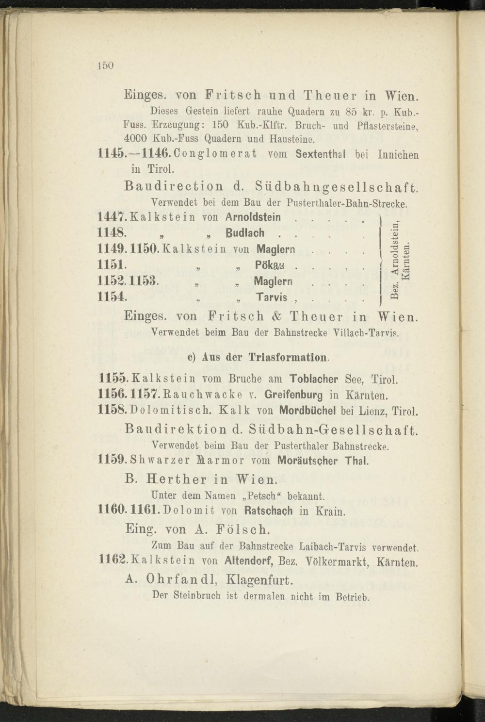 Baudirection d. Südbahngesellschaft. Verwendet bei dem Bau der Pusterthaler-Bahn-Strecke. 1447. K alkstein von Arnoldstein.1 .