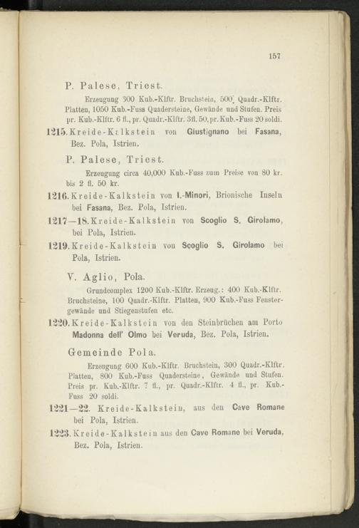 Erzeugung 600 Kub.-Klftr. Bruchstein, 300 Quadr.-Klftr. Platten, 800 Kub.-Fuss Quadersteine, Gewände und Stufen. Preis pr. Kub.-Klftr. 7 fl., pr. Quadr.-Klftr. 4 fl., pr. Kub.- Fuss 20 soldi.