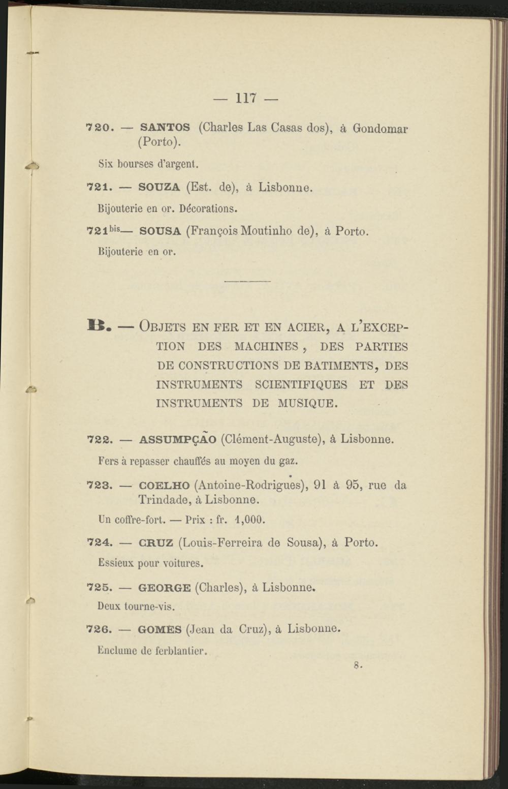 722. — ASSUMPÇAO (Clément-Auguste), à Lisbonne. Fers à repasser chauffés au moyen du gaz.