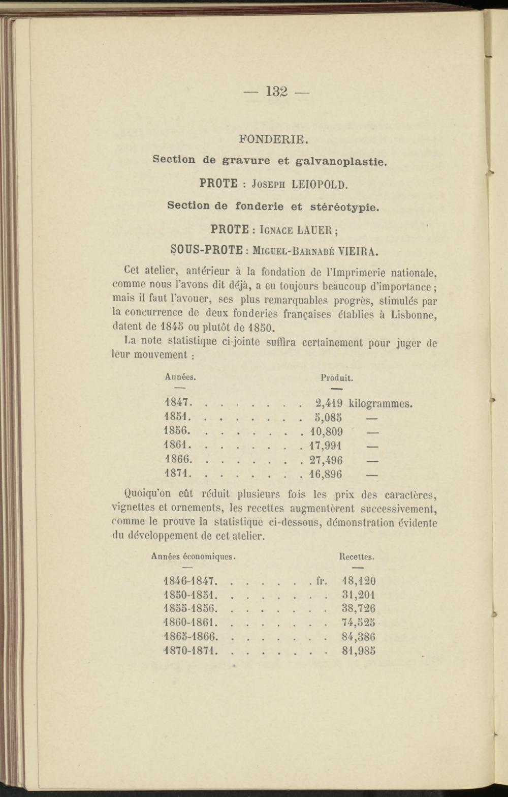 Cet atelier, antérieur à la fondation de l’Imprimerie nationale, comme nous l’avons dit déjà, a eu toujours beaucoup d’importance ; mais il faut l’avouer, ses plus remarquables progrès, stimulés par la concurrence de deux fonderies françaises établies à Lisbonne, datent de 1845 ou plutôt de 1850.